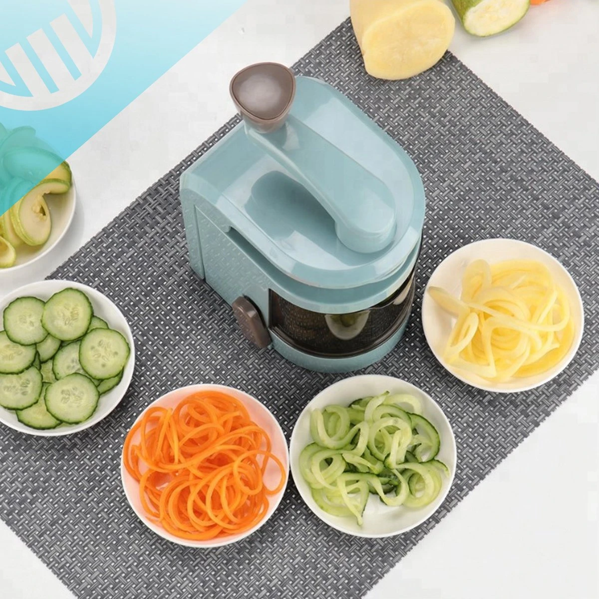 Extra Sleutelwoorden: zoete aardappel, potato twister, courgetteslierten, komkommerslierten, krulfriet, wortels, flespompoen, low carb diet, papaya, rasp, keukenrasp, pastinaak