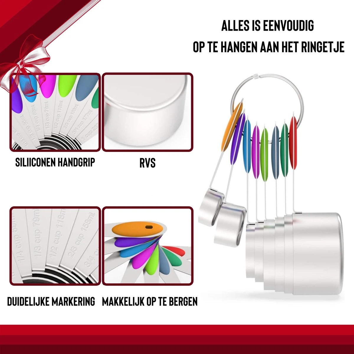- Complete 16-delige set: in deze set niet één maatbeker, maar 8 verschillende maten. Ook krijg je 8 verschillende maatschepjes. Deze 16-delige set is ideaal voor zowel kleine als grote hoeveelheden. Je hebt dus altijd de gewenste maat bij de hand.
