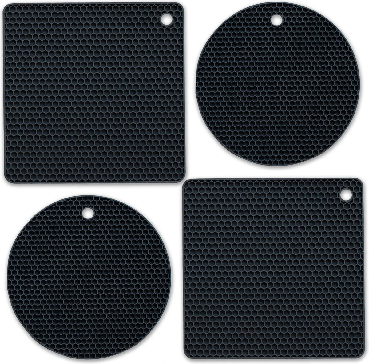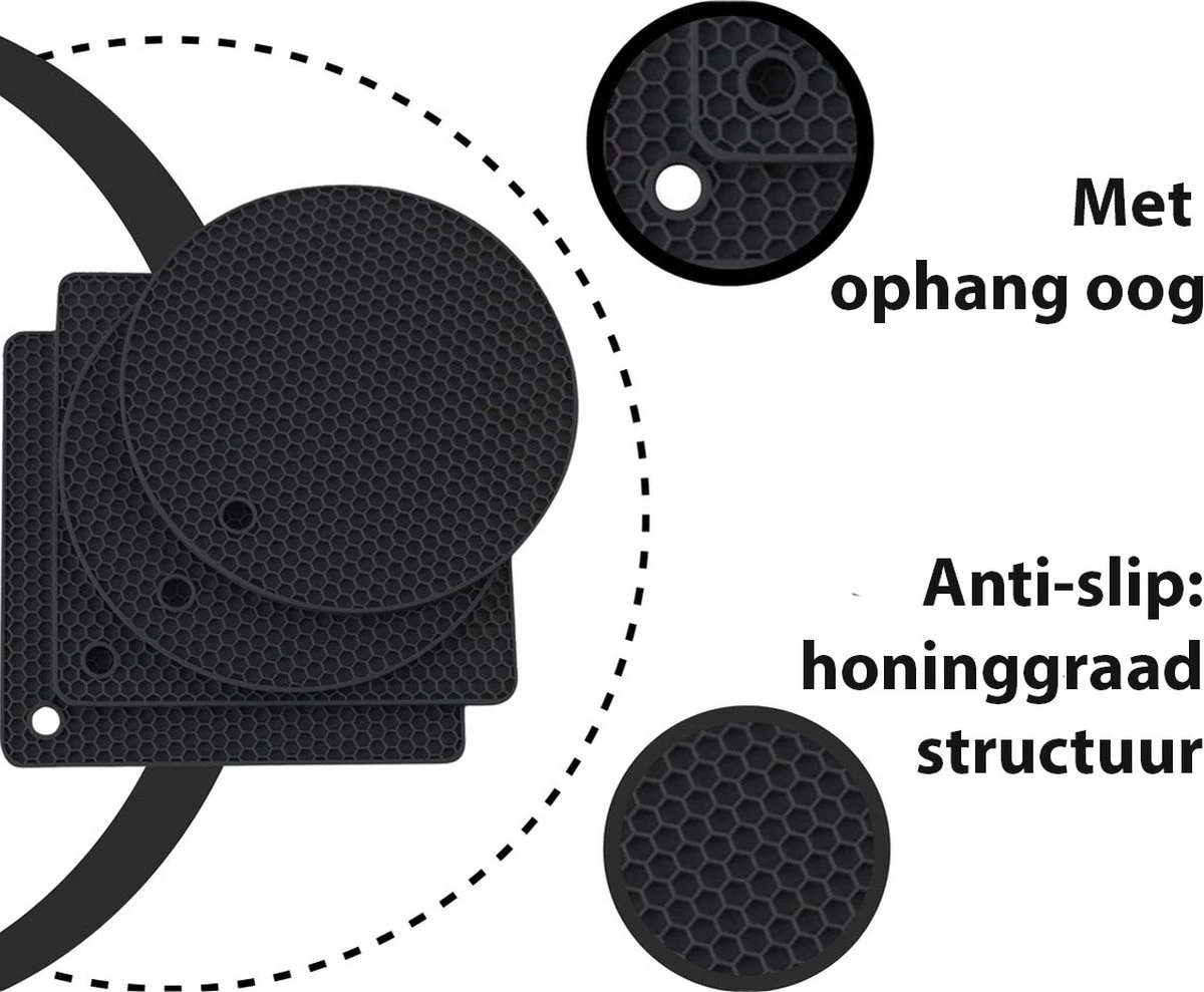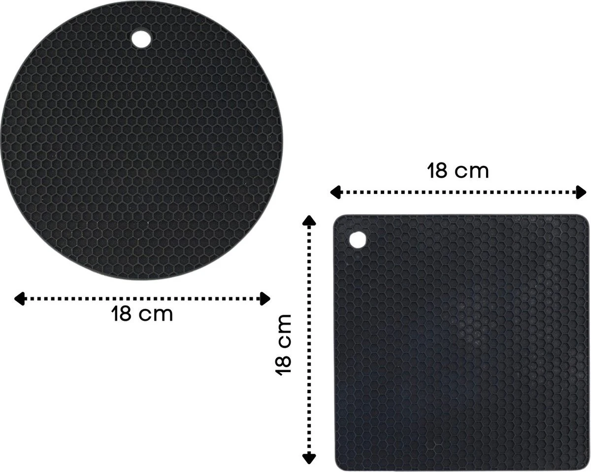 Gemaakt van 100% hoogwaardige en duurzame kwaliteit siliconen. Dit zorgt ervoor dat hittebestendige materialen makkelijk vast te pakken zijn en je de onderzetters snel weer schoon kunt maken. Met een diameter van 18cm zijn ze geschikt voor elke pan. Via de honingraat structuur zal het vocht in de gleuven komen en dit voorkomt dat potten of pannen kunnen gaan schuiven. Daarnaast zien ze er natuurlijk zeer hip uit!