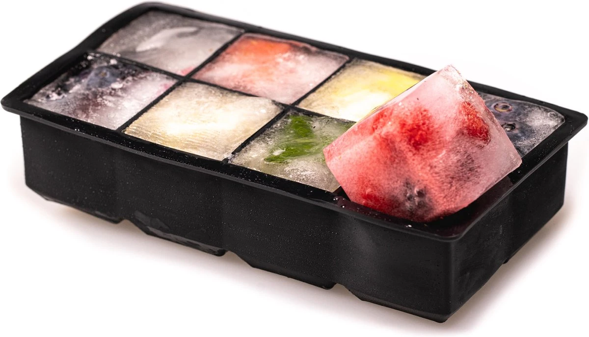 Met ijsblokjes uit deze Sareva ijsblokjeshouder koelen je cocktails sneller. Door hun uitzonderlijke grootte smelten de ijsblokjes ook trager, waardoor je drank langer zijn smaak behoudt. De ijsblokjes kunnen per 8 stuks worden gemaakt en krijgen een een grootte van 5 cm bij 5 cm. Tevens is de ijsblokjeshouder gemaakt van siliconen, waardoor de bollen er gemakkelijk uit te krijgen zijn.Hoe maak je perfecte ijsblokjes?Neem de onderste siliconenhelft vast, met de voetjes aan de onderkant. Vul deze helemaal met water tot aan de bovenste rand. Leg de ijsblokhouder voldoende lang in de diepvries. Haal nadien de ijsballen eruit. Dit gaat zeer gemakkelijk door de flexibiliteit van silicone. Voor nog meer cocktail fun kunt u de ijsballen ook een fruitsmaak geven. Door vruchtensap of stukjes van vruchten zoals framboos, aardbei, kers, citroen en limoen aan het water toe te voegen.