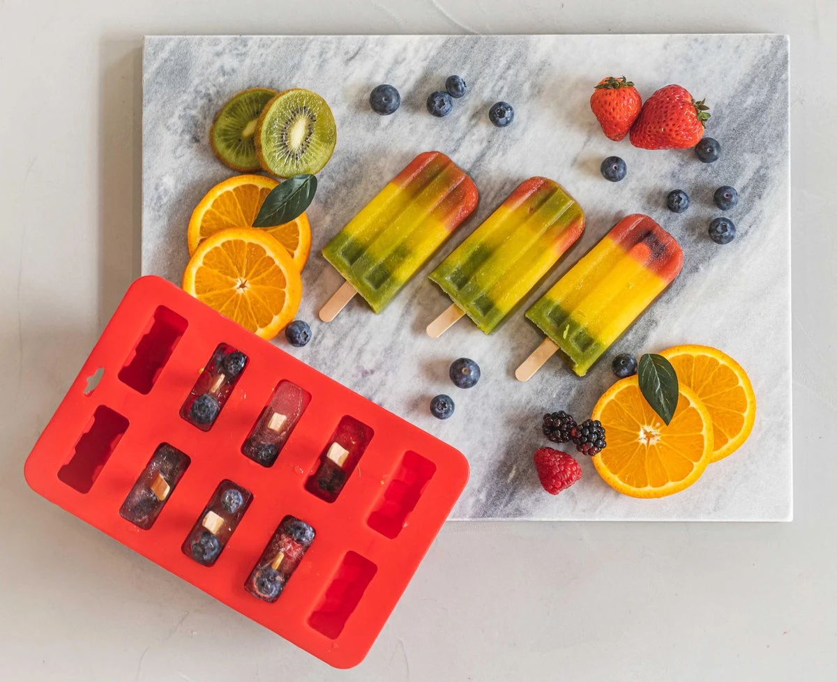 Yoghurt-, siroop- of fruitijsjes maken? Het kan allemaal met deze Sareva ijsjesmaker. Het rode keukenhulpje bestaat volledig uit siliconen. Dit materiaal is erg flexibel en bevat een natuurlijke anti-aanbaklaag waardoor je ijsjes een stuk makkelijker uit de vorm komen. De ijsjesmaker is bestand tegen een temperatuur tot maar liefst -40 graden! Na gebruik kan de sareva ijsjesmaker gewoon in de vaatwasser.Handig: de Sareva IJsjesmaker van siliconen heeft een deksel, waardoor je minder kans op knoeien hebt. Er is een setje houten ijsstokjes inbegrepen die je gewoon door de deksel heen kan steken. Met een Sareva ijsjesmaker van siliconen maak je tien ijsjes tegelijk. Uitdelen maar!