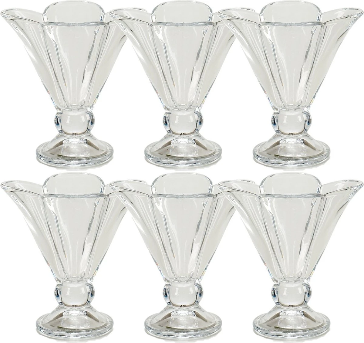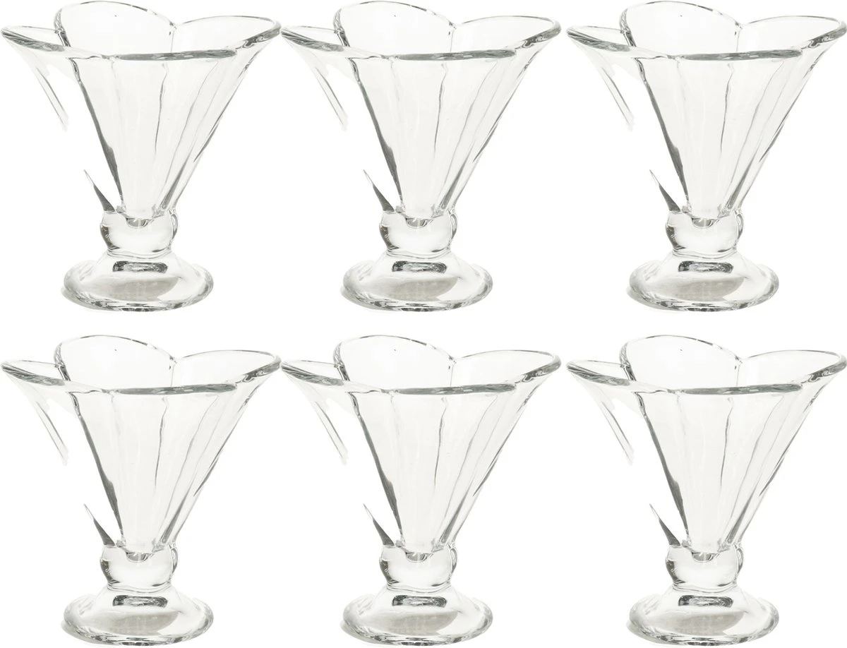 Set van 6x stuks ijscoupes/ijsschaaltjes 200 ml. Afmeting ca: 13 x 13 x 12 cm. Materiaal: gehard glas. Reinigen: vaatwasser geschikt.