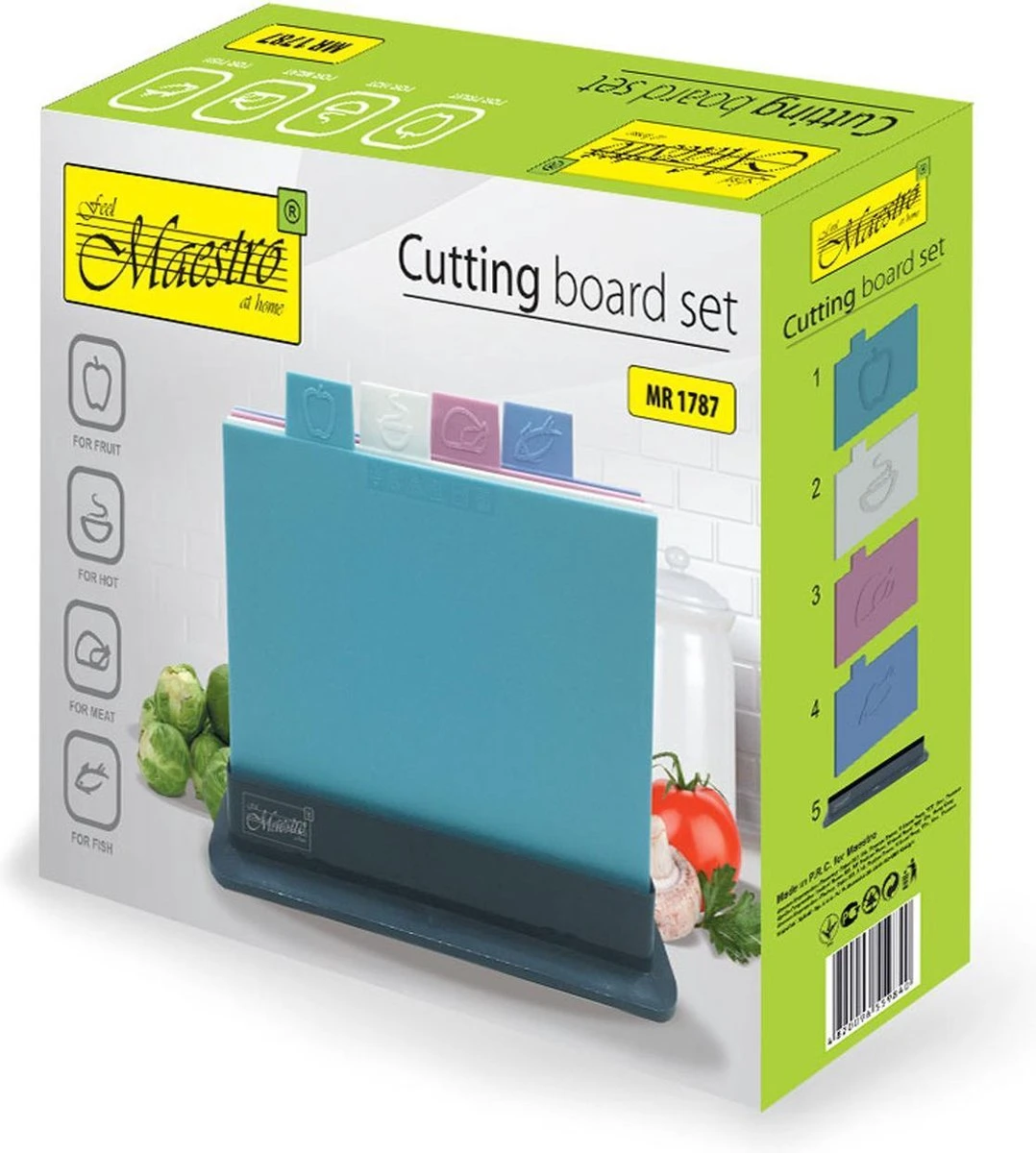 Set van vier rechthoekige dubbelzijdige borden voor diverse soorten producten. Hierdoor wordt voorkomen dat het gesneden voedsel de smaak van andere voedingsproducten overneemt.