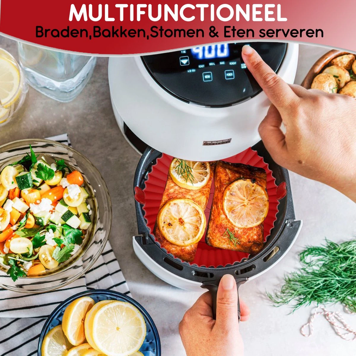 Vergeleken met de wegwerp papiervoeringen, kunnen de siliconen bakjes vele malen worden gebruikt zonder vervorming of schade. Dat is handiger en bovendien milieuvriendelijker. Verder is het siliconen materiaal beter bestand tegen hitte dan papier en daarom heb je geen zorgen over verbrand papier bij te lange bereidingstijden. Met de herbruikbare heteluchtfriteuse bakjes serveer je altijd een extra lekkere maaltijd, omdat je achteraf minder hoeft schoon te maken.