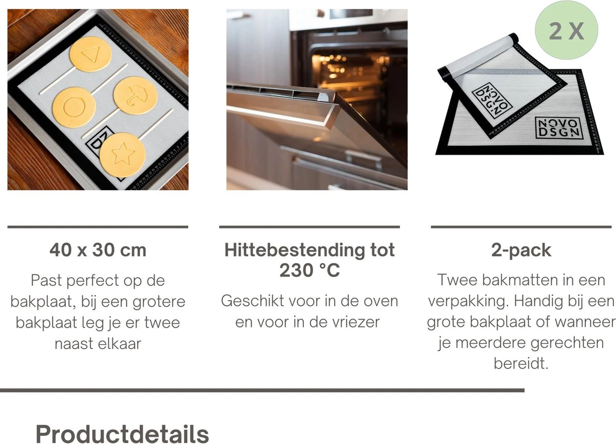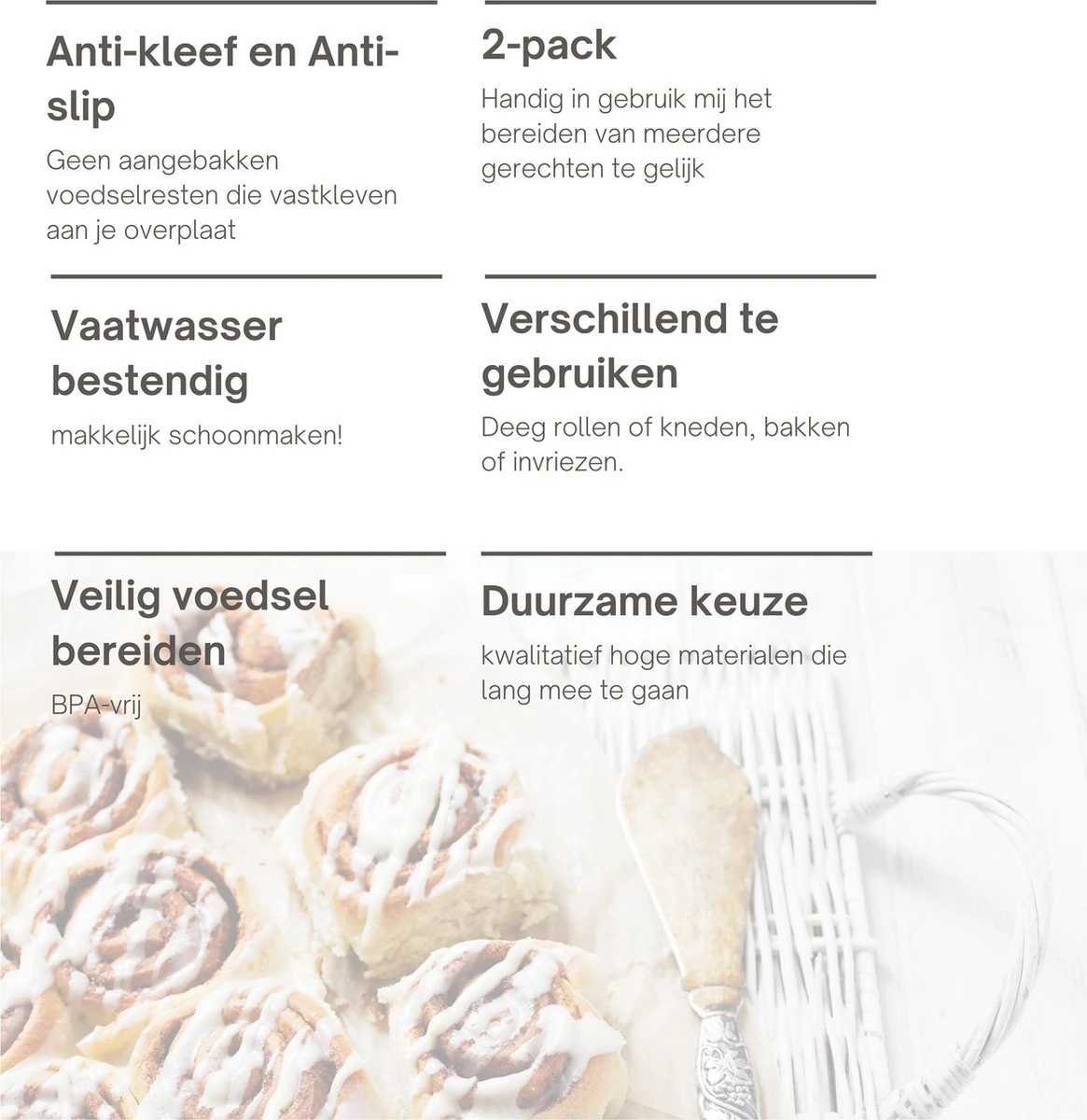 - Set van 2 stuks: Extra voordeel! Bij ons ontvang je 2 bakmatten, handig bij bereiding van meerdere gerechten te gelijk. Of heb jij een bakplaat die groter is dan 42×30 cm? Dan leg je eenvoudig twee bakmatten naast elkaar.
