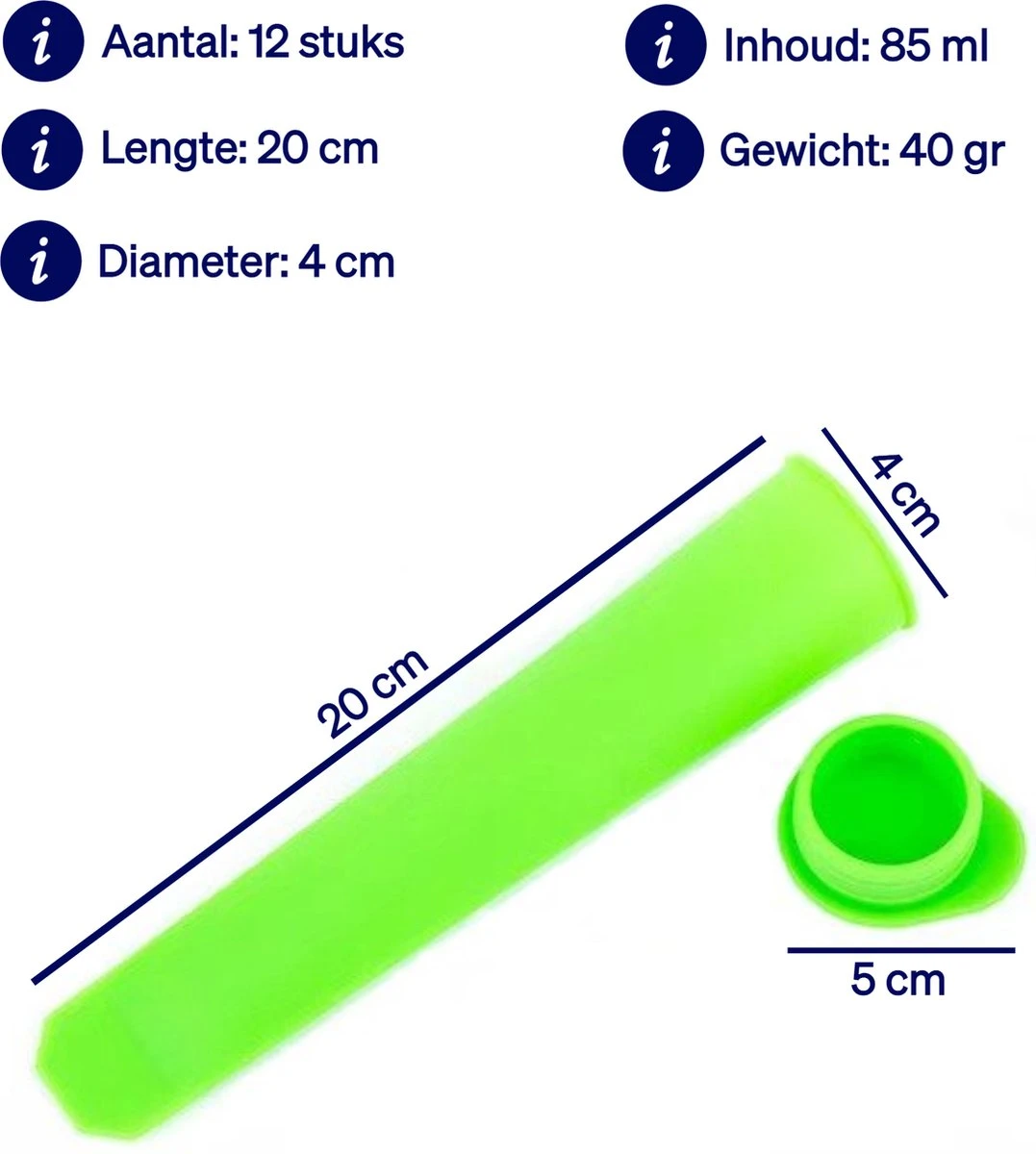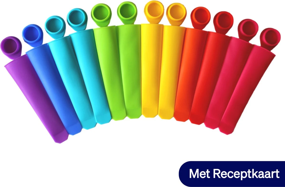 IJsjes, wie is er niet dol op? Heerlijk op een warme zomerse dag verkoeling zoeken met een zelf gemaakt ijsje! Met de BPA vrije ijsvormpjes maak je in een handomdraai de lekkerste ijsjes! De ijsvormen zijn gebruiksvriendelijk en gemaakt van hoge kwaliteit siliconen. Maak deze zomer jouw unieke creatie! Om je een goede start te geven hebben wij er alvast een zomerse receptkaart voor je bijgedaan. Deze variant van onze ijsvormpjes telt maarliefst 8 verschillende (felle) kleuren en zijn ook een slagje groter. Dat betekent nog meer genieten!
