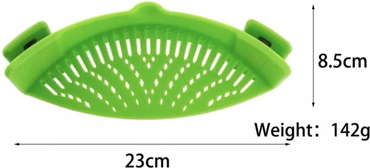 Dit is de nieuwste, meest praktische manier om uw voedsel grondig te zeven en te voorkomen dat het voedsel uit de pan komt. De siliconen vergiet is flexibel genoeg om op bijna alle potten, pannen en schalen te passen. Het klikt netjes vast met twee clips. De sterke grip van de clips houdt het veilig vast tijdens het gebruik en kan tijdens het koken aan de pot blijven zitten. Zodra de pan met voedsel klaar is, kan deze over een gootsteen of kom worden gekanteld en doet de siliconen vergiet zijn magie. De vloeistoffen worden afgegoten terwijl het voedsel in de pot blijft, zelfs met zwaarder voedsel zoals aardappelen.