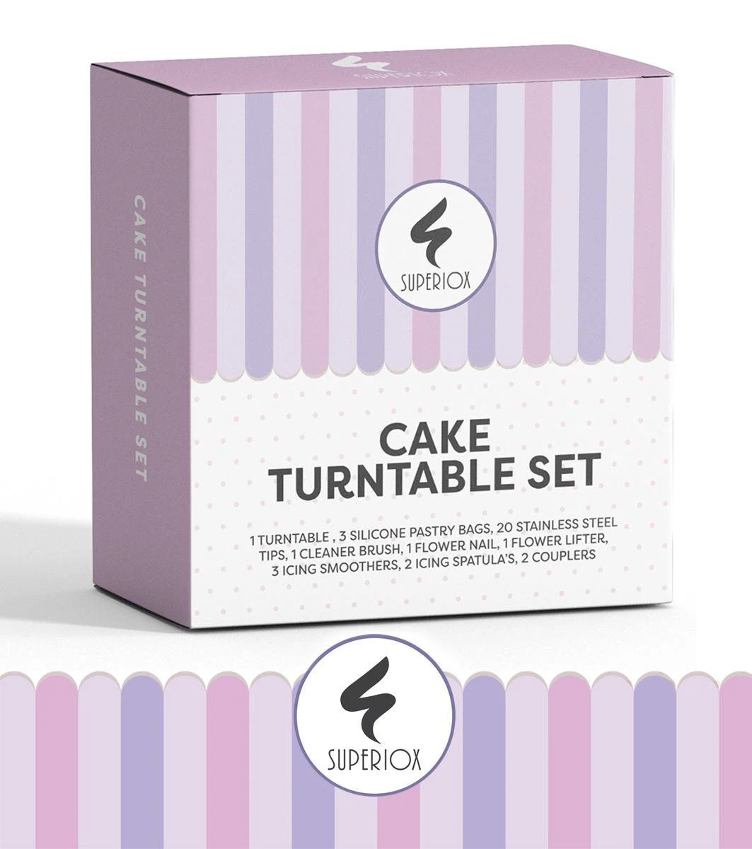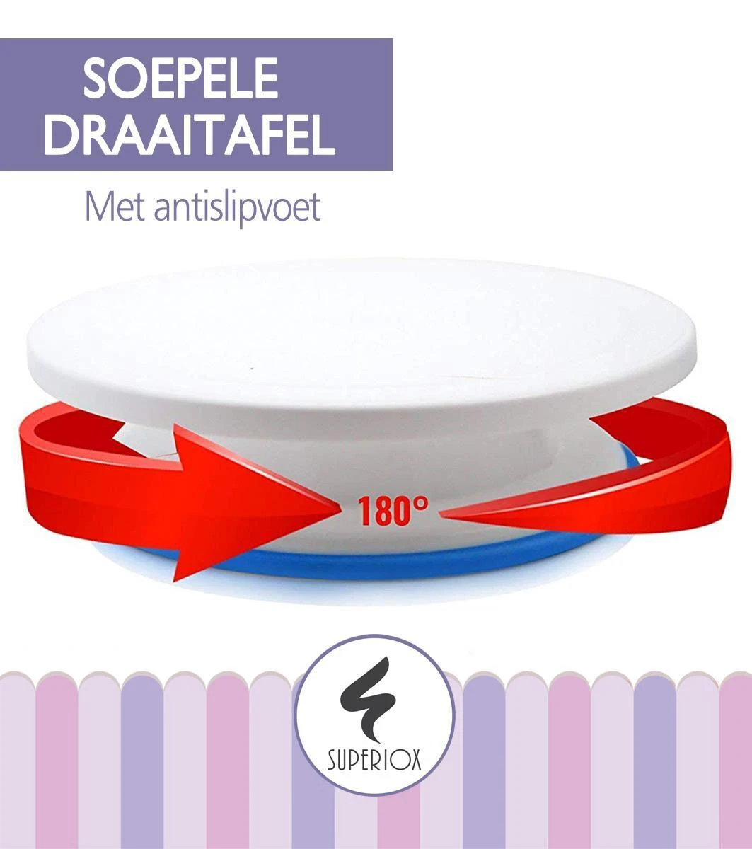 Onze draaitafel heeft een silicone basis om uitglijden te voorkomen tijdens het decoreren van uw culinaire meesterwerk! Deze set bevat ook drie siliconen spuitzakken, zodat u niet telkens de spuitzakken hoeft te vervangen als u een andere kleurstof wilt. Onze set bevat zowel grote als kleine nummering tips voor grote gebieden en fijne details. Met de flower nails and de bloemheffer schaar kun je de mooiste bloemetjes creëren voor de decoratie van je taart!