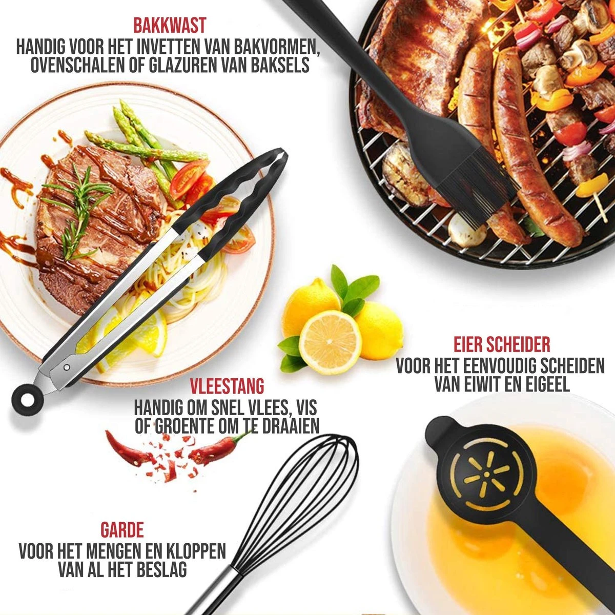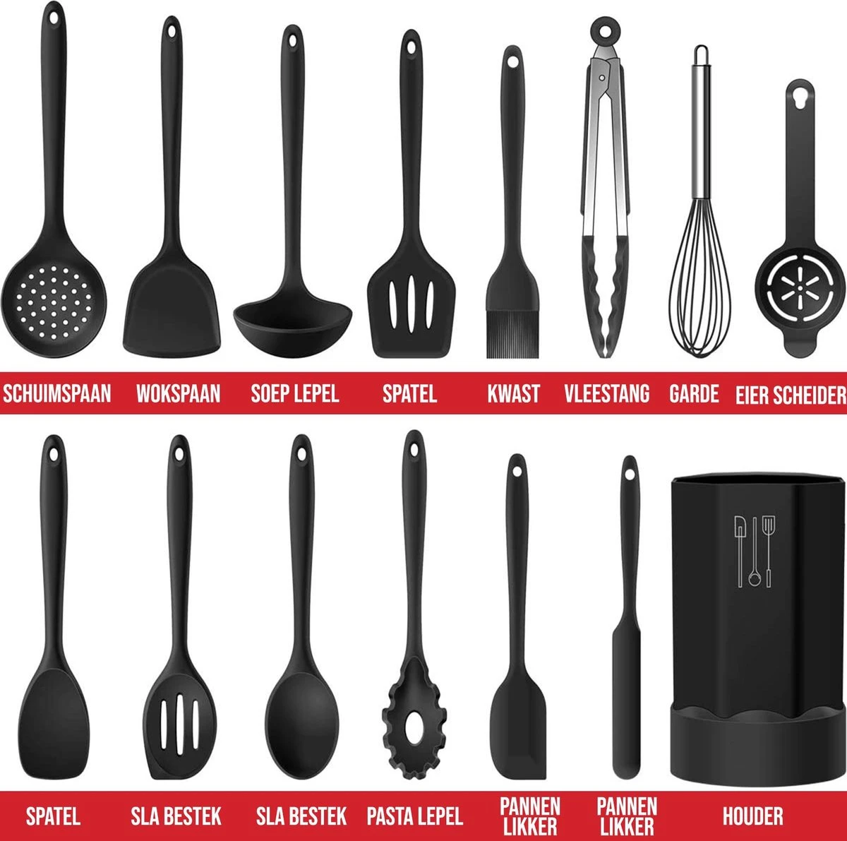 Gek op koken maar mis je de juiste spullen? Deze 15-delige keukengerei set heeft alles wat je nodig hebt! Met hoogwaardig materiaal, een bijgeleverde houder en stijlvol ontwerp transformeer jij jouw keuken met slechts één set. Koken, grillen of toch liever bakken? Deze siliconen set kan écht alles. Lepels, tangen & de fijnste spatels. Dit veelzijdige pakket heeft het allemaal!
