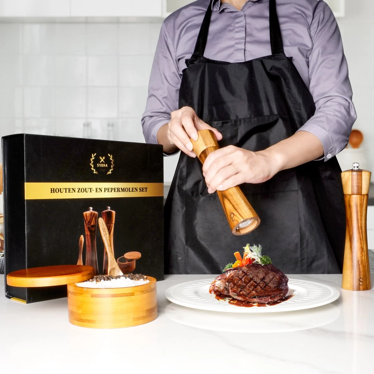 Op zoek naar een stijlvolle en duurzame peper- en zoutmolen set? Deze luxe set van Sybra is dé peper- en zoutmolen set voor iedere keukenprins(es). De set is handgemaakt van kwalitatief hoogstaand en duurzaam acacia hout. Een absolute eyecatcher in jouw keuken!