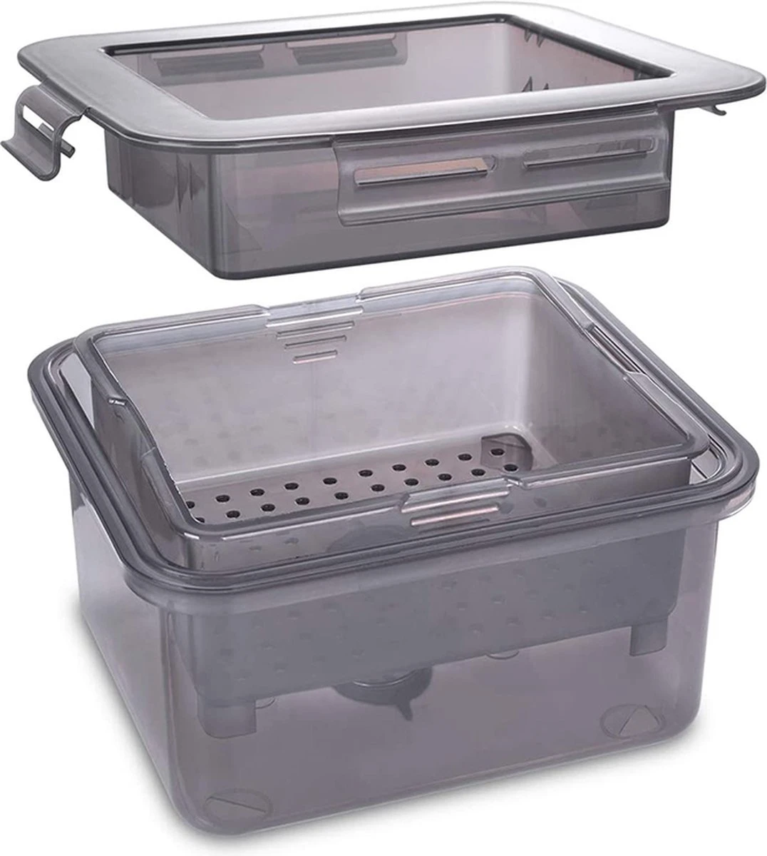 - Duw de tofu aan met de deksel en sluit deze af door middel van de 4-sluitingen op de zijkanten. Hierdoor blijft er een continue druk op de tofu staan en wordt het vocht er langzaam uitgeperst.