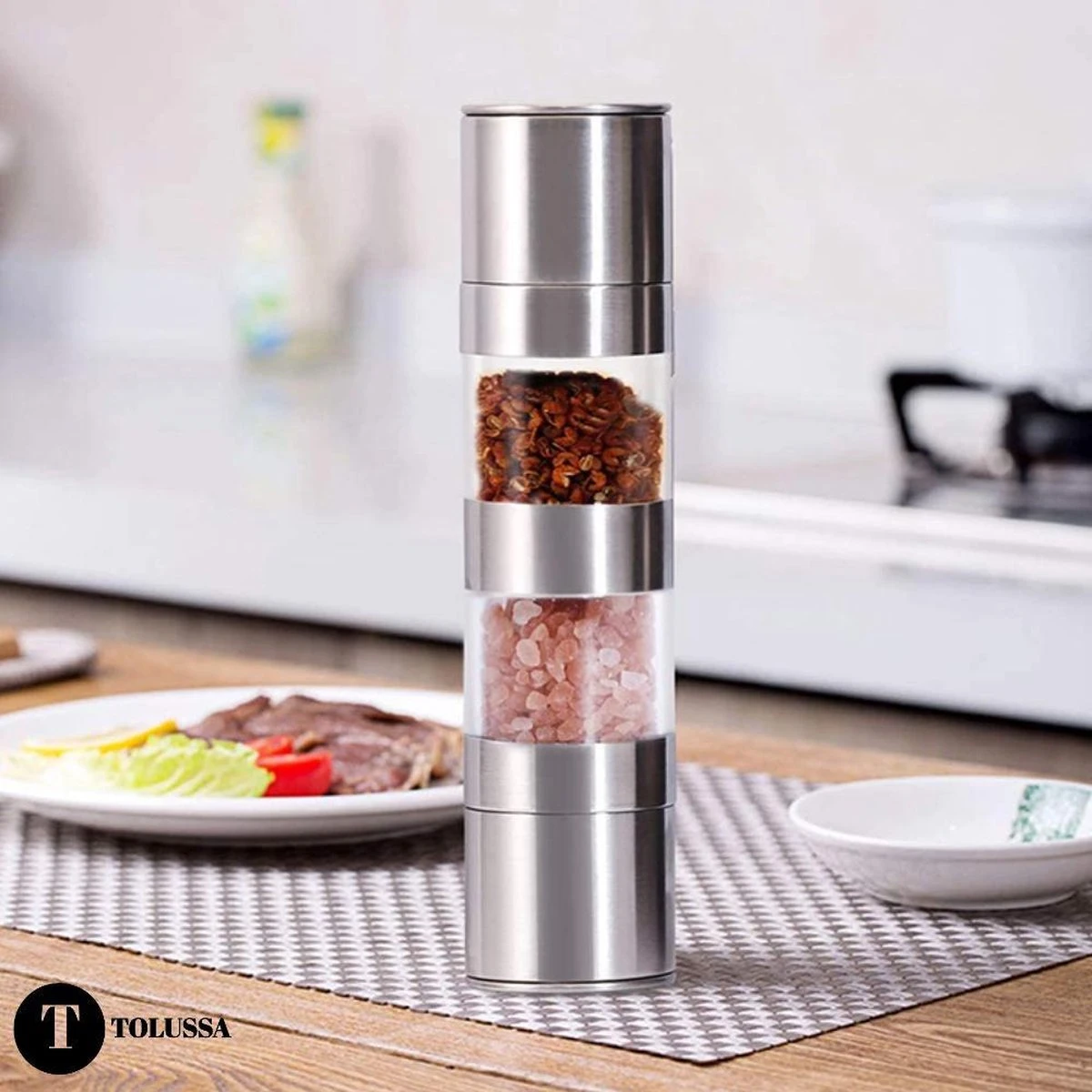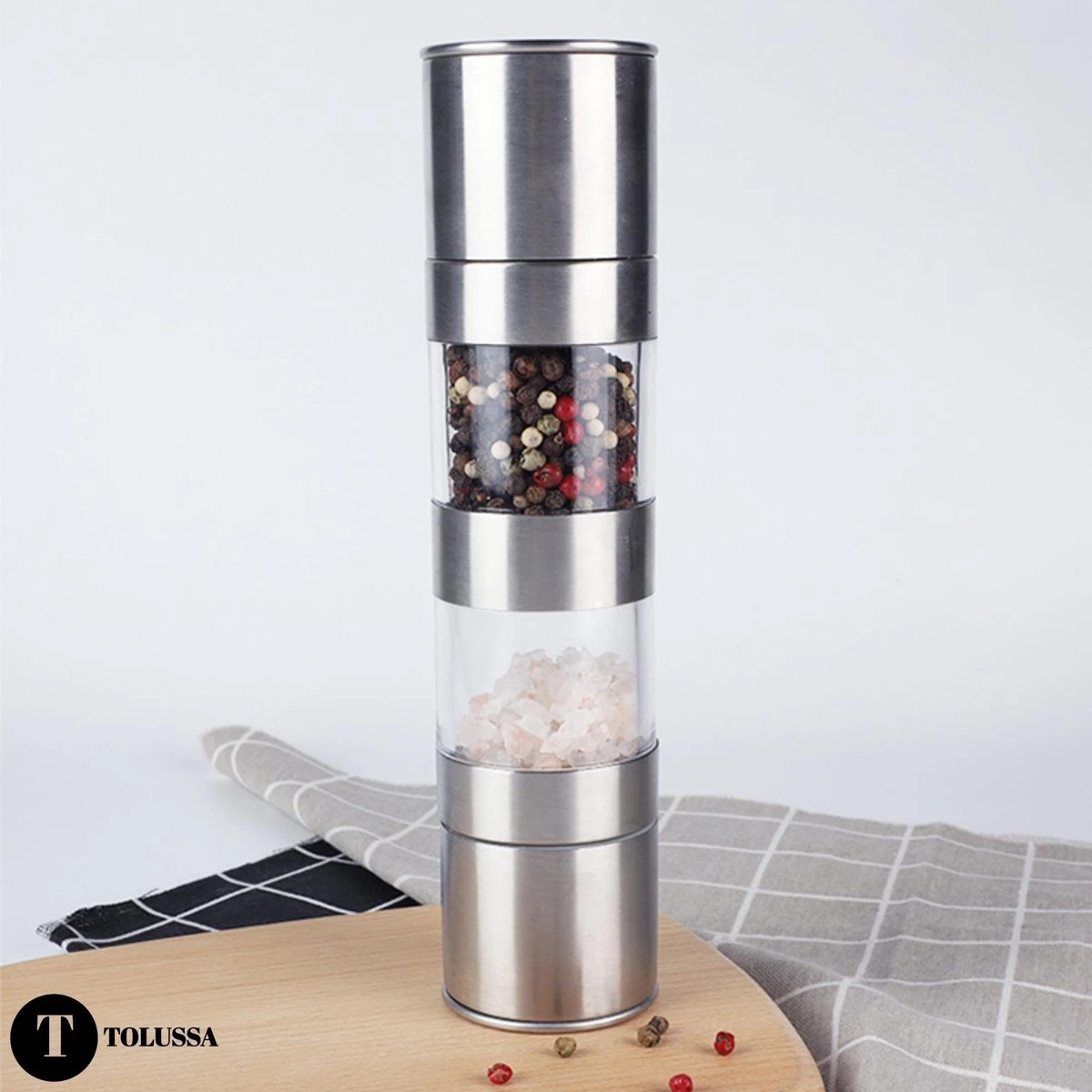 - Multifunctioneel: onze Tolussa 2 in 1 peper- en zoutmolen heeft een instelbare maalgraad. Hiermee kun je de korrels naar wens malen, van fijn tot grof. Ideaal voor al jouw gerechten die een personal touch nodig hebben met peper en zout!
