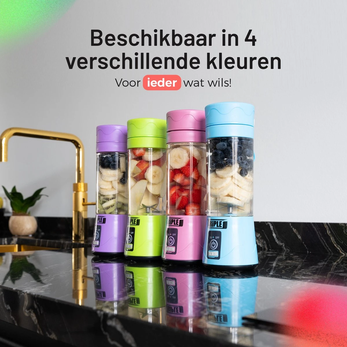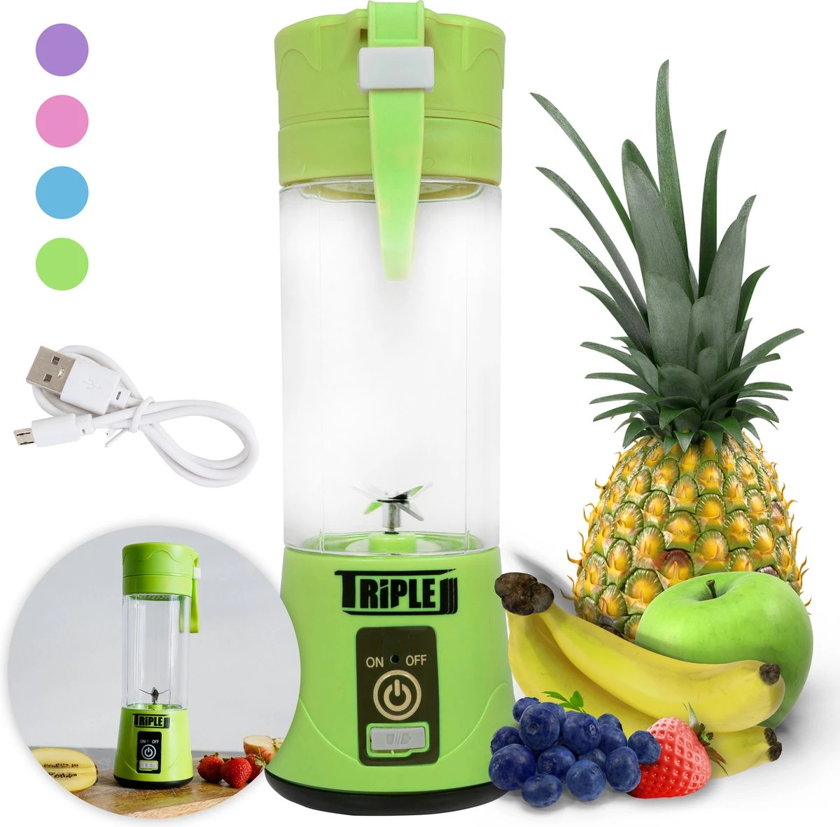 Deze Blender To Go heeft een inhoud van 380ml en is verkrijgbaar in de kleuren roze, groen, paars en blauw. De blender is USB-oplaadbaar en 10 tot 12 keer te gebruiken op een volle batterij. Batterij leeg? Geen probleem! Gebruik de bijgeleverde oplaadkabel en de blender is met 3 uren weer volledig opgeladen. Zorg ervoor dat je elke dag je vitamines binnen krijgt met de Triple J® Blender To Go!