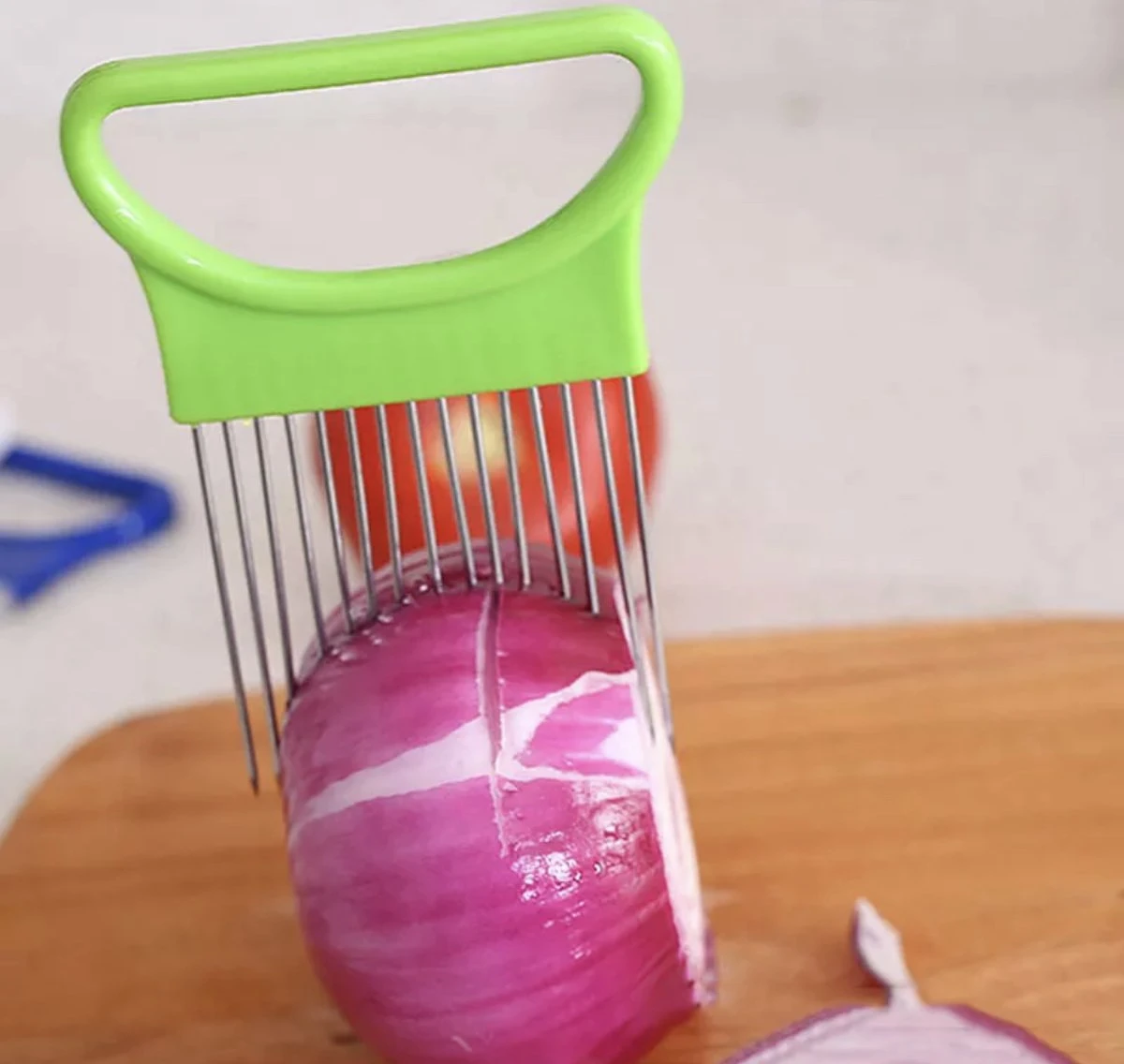 Met deze handige snij-tool, kun je heel eenvoudig plakjes van je uien, tomaten en andere groente / fruit snijden Zonder dat u in uw vingers snijdt! Voortaan geen gedoe meer dus! Doordat hij van onder andere van RVS gemaakt, is hij eenvoudig schoon te maken.