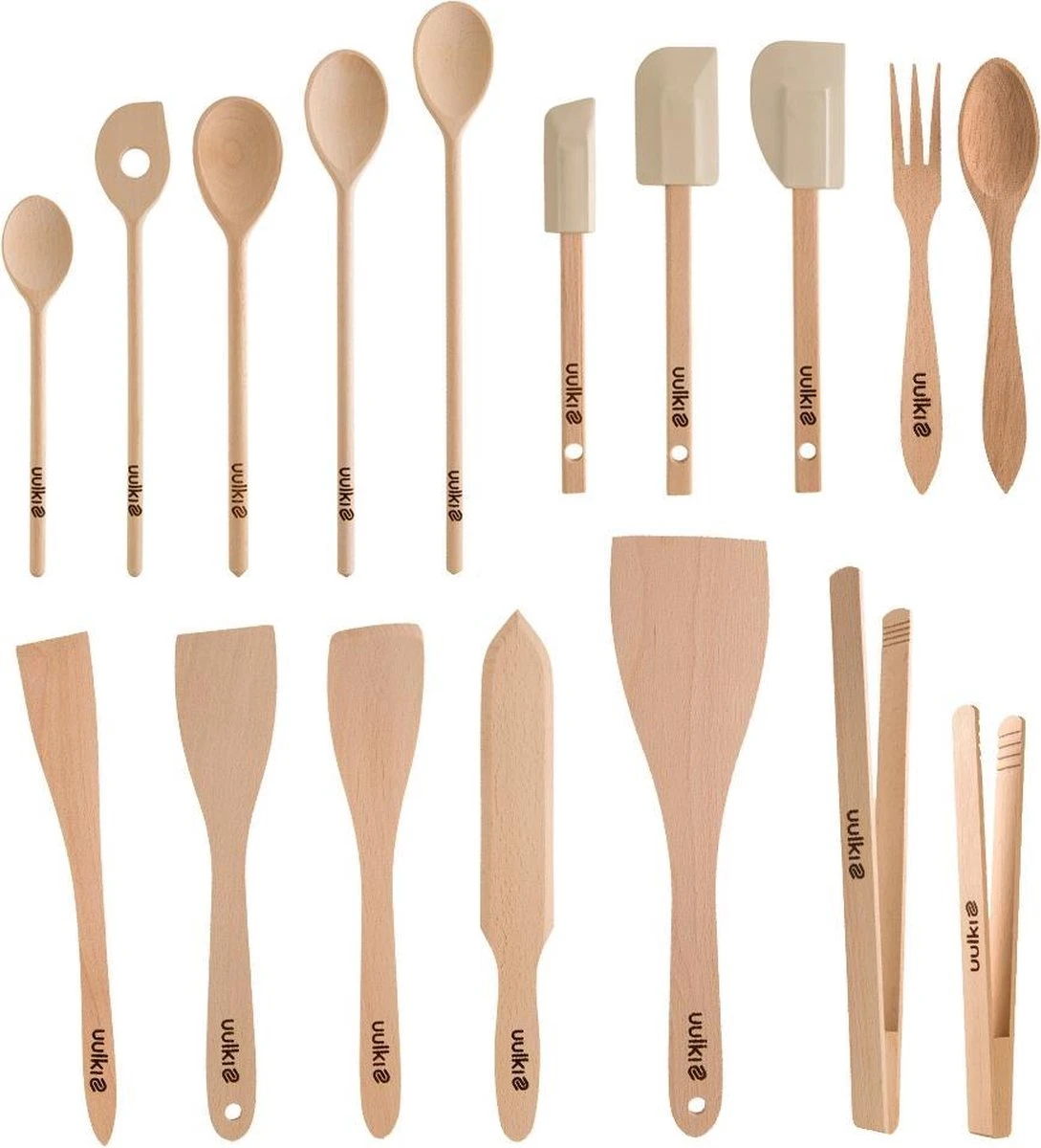 Met de 17-delige set keukenhulpen van Uulki heb je alle noodzakelijke keukengerei om lekker te kokkerellen. Het houten keukengerei wordt in België vervaardigd uit lokaal, duurzaam en onbehandeld beukenhout uit de Ardennen. Hout heeft van nature antibacteriële eigenschappen en is erg hygiënisch. Bovendien brengt houten keukengerei geen schade toe aan je potten en pannen, waardoor je ze ook kan gebruiken in pannen en potten met een antiaanbaklaag. Deze keukenset staat goed in elke keuken en vormt het perfecte geschenk voor iemand die voor het eerst alleen gaat wonen, een pas gehuwd koppel, familie of vrienden, of gewoon voor jezelf.