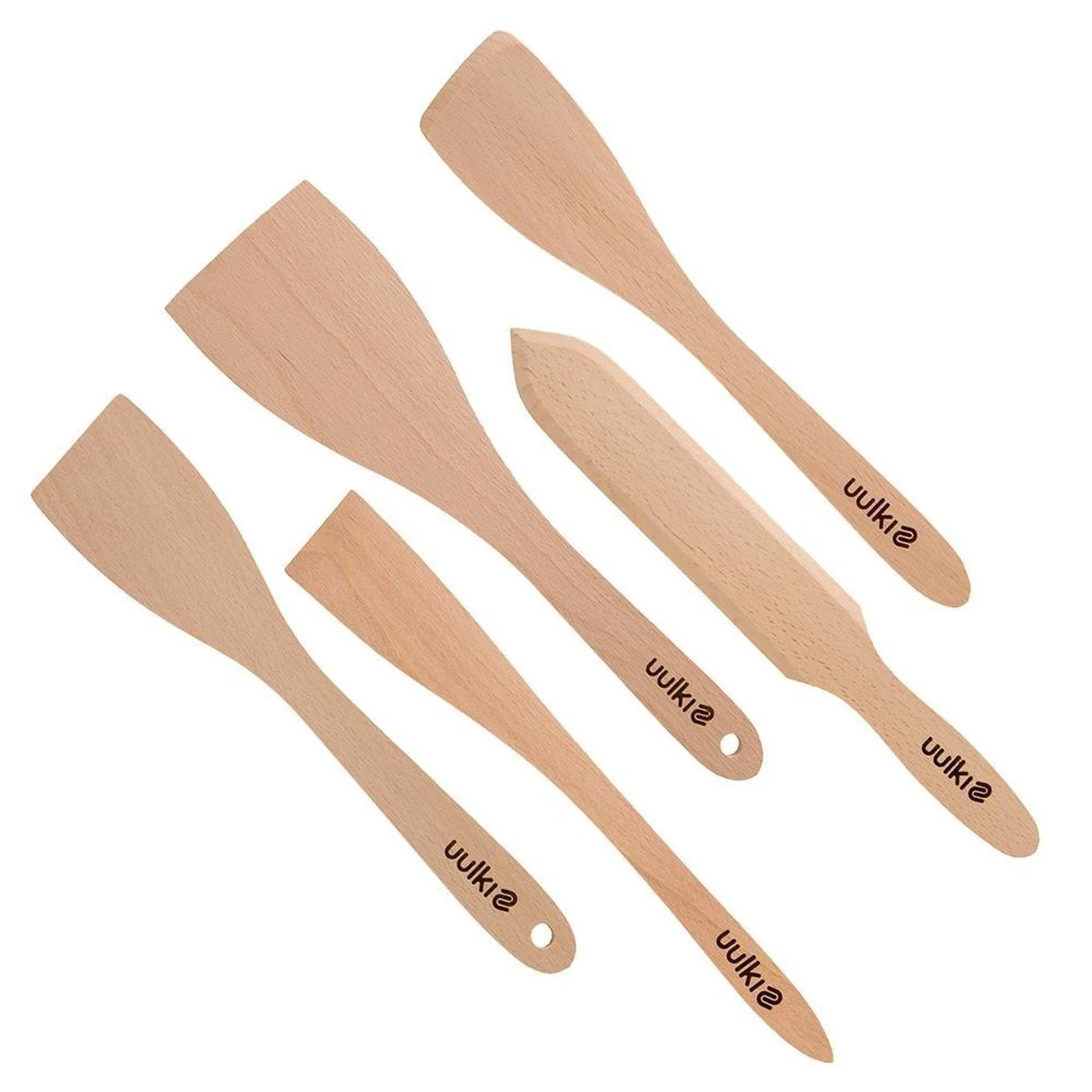 – 5 houten spatels voor het dagelijkse bakken en braden, verschillende afmetingen: klein 30×4,2cm; medium plat 30×6 cm; medium gekromd 30×5.5 cm; extra groot plat 32.5×9 cm; pannenkoekenspatel met scherpe punt 32.7×4.6 cm.