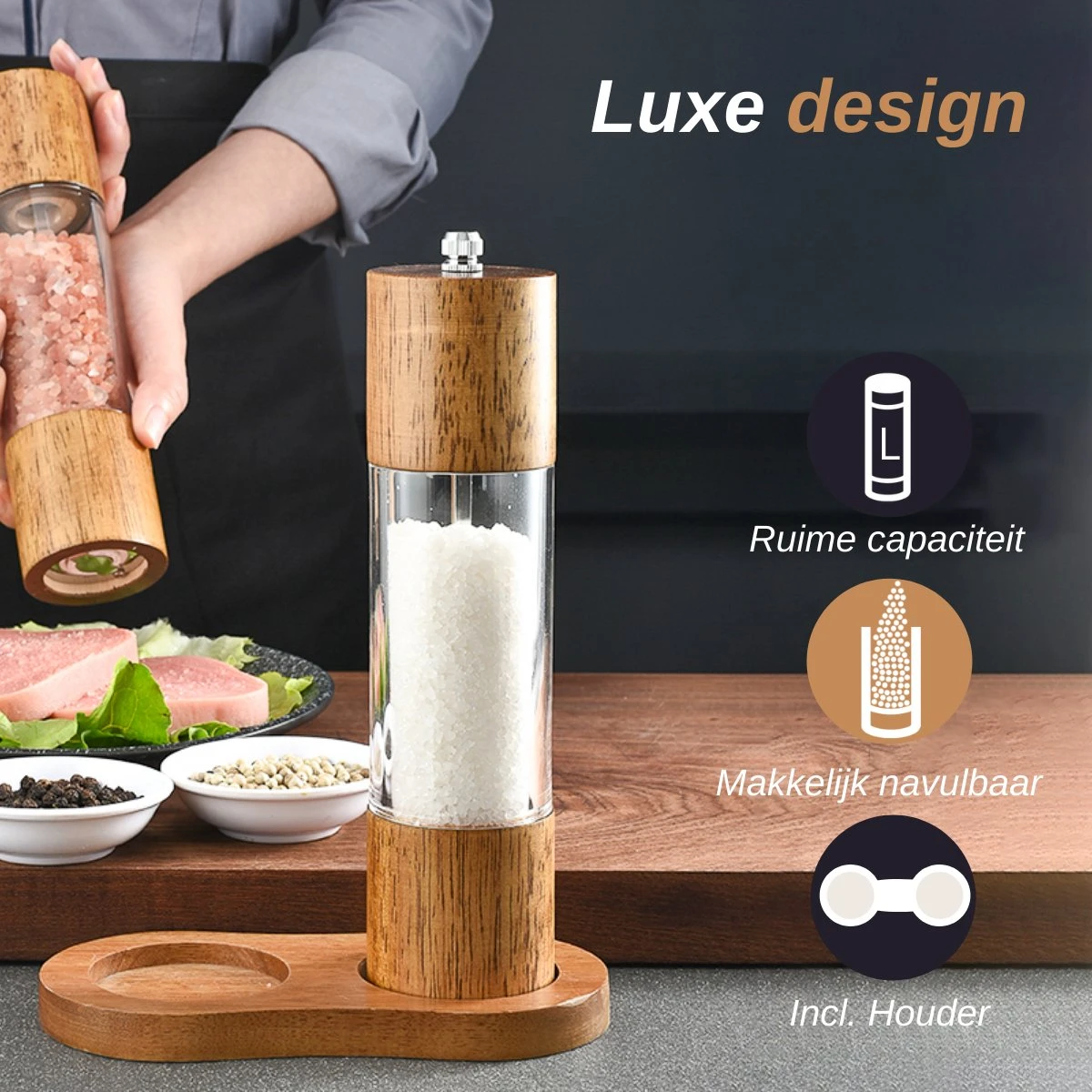 Verrijk je eettafel met deze elegante en stijlvolle peper en zoutmolen set met houder. Vervaardigd uit alleen de beste materialen. Te gebruiken als pepermolen, zoutmolen, kruidenmolen, en zelfs koffiemolen. Ideaal als aanvulling op het keukengerei of als onderdeel van je BBQ accesoires. Cadeautip: De set komt in een luxe verpakking!