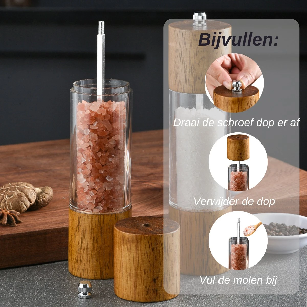 het doorzichtige middenstuk van de molen verhult direct wanneer de molen bijgevuld dient te worden. Zo zit je nooit meer plotseling zonder peper, zout of andere kruiden. Haal gemakkelijk de bovenkant van de molens en vul de molens bij.