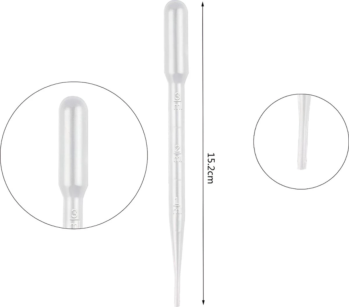 - De 1 ml tot 3 ml graduaties zijn vrij duidelijk gemarkeerd op de pipet. Eenvoudig overbrengen en afmeten van vloeistoffen en alles heeft zoals bedoeld werkt, zonder tijdens de overdracht te druppelen of te lekken.