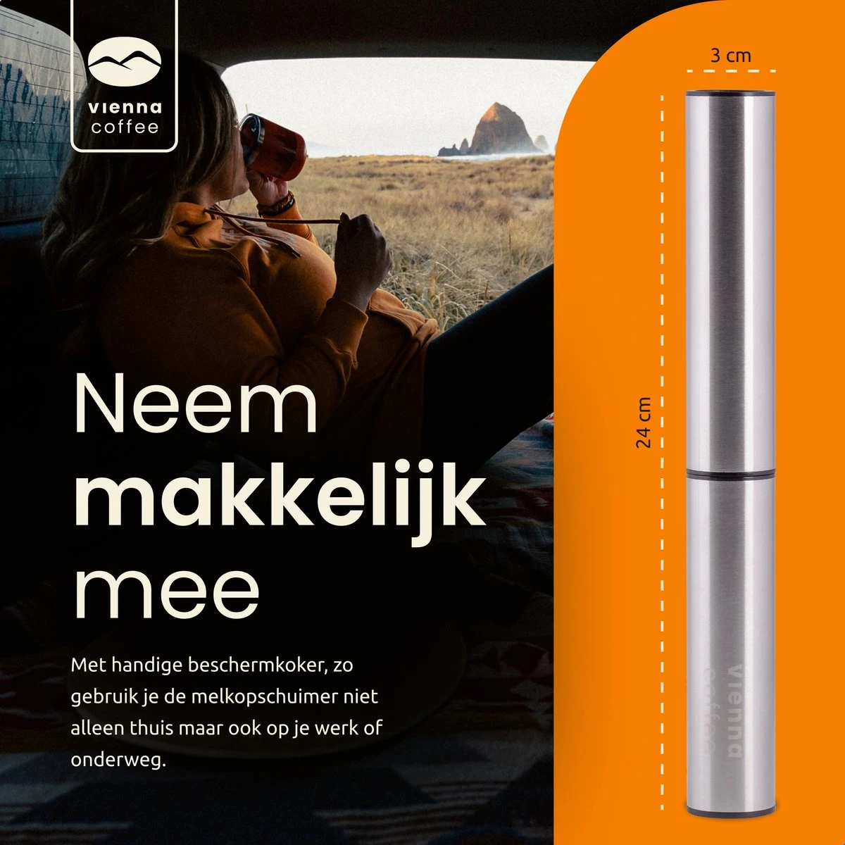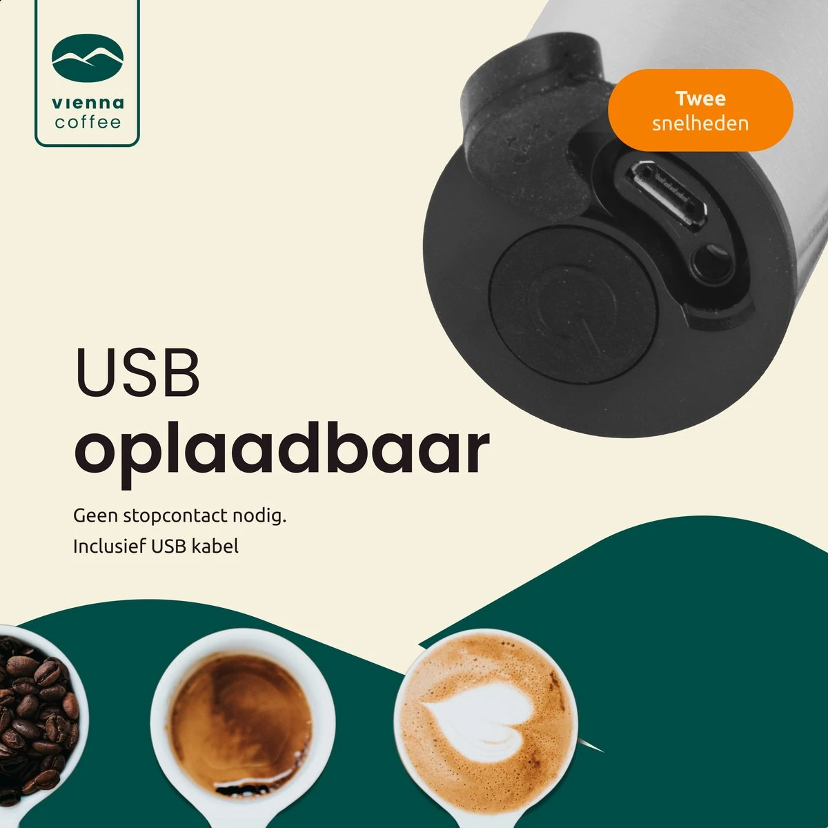 Thuis zelf eenvoudig heerlijke melkschuim maken? Maak zelf in snel tempo heerlijk melkschuim voor je cappuccino of latte macchiato met de Vienna Coffee handmatige melkopschuimer! Dankzij de 2 snelheden klop in snel tempo je melk stevig en luchtig voor je koffie, latte, cappuccino, matcha, warme chocolademelk. Doordat de melkopschuimer oplaadbaar is hoef je nooit meer nieuwe batterijen te kopen, en kan je de melkopschuimer 180 keer gebruiken op volle batterij. De melkopschuimer is gemaakt van RVS en wordt geleverd met twee handige opzetstukken en oplaadkabel.