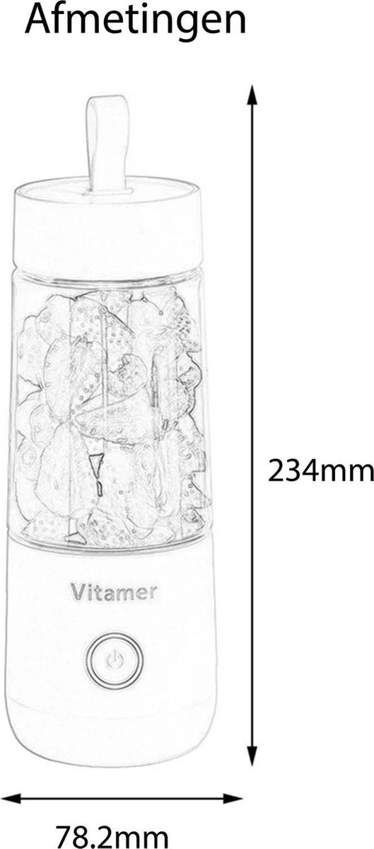 Met een deze draagbare blender van Vitamer kun jij overal een heerlijke smoothie maken! Neem deze blender mee naar je werk, school, sportclub of andere evenementen en verzeker jezelf altijd van een verse smoothie. Door dit handige formaat past deze draagbare blender in elke tas en kun jij dus overal een lekker smoothie maken. Deze portable blender is makkelijk schoon te maken en daardoor ideaal meerdere keren per dag te gebruiken.