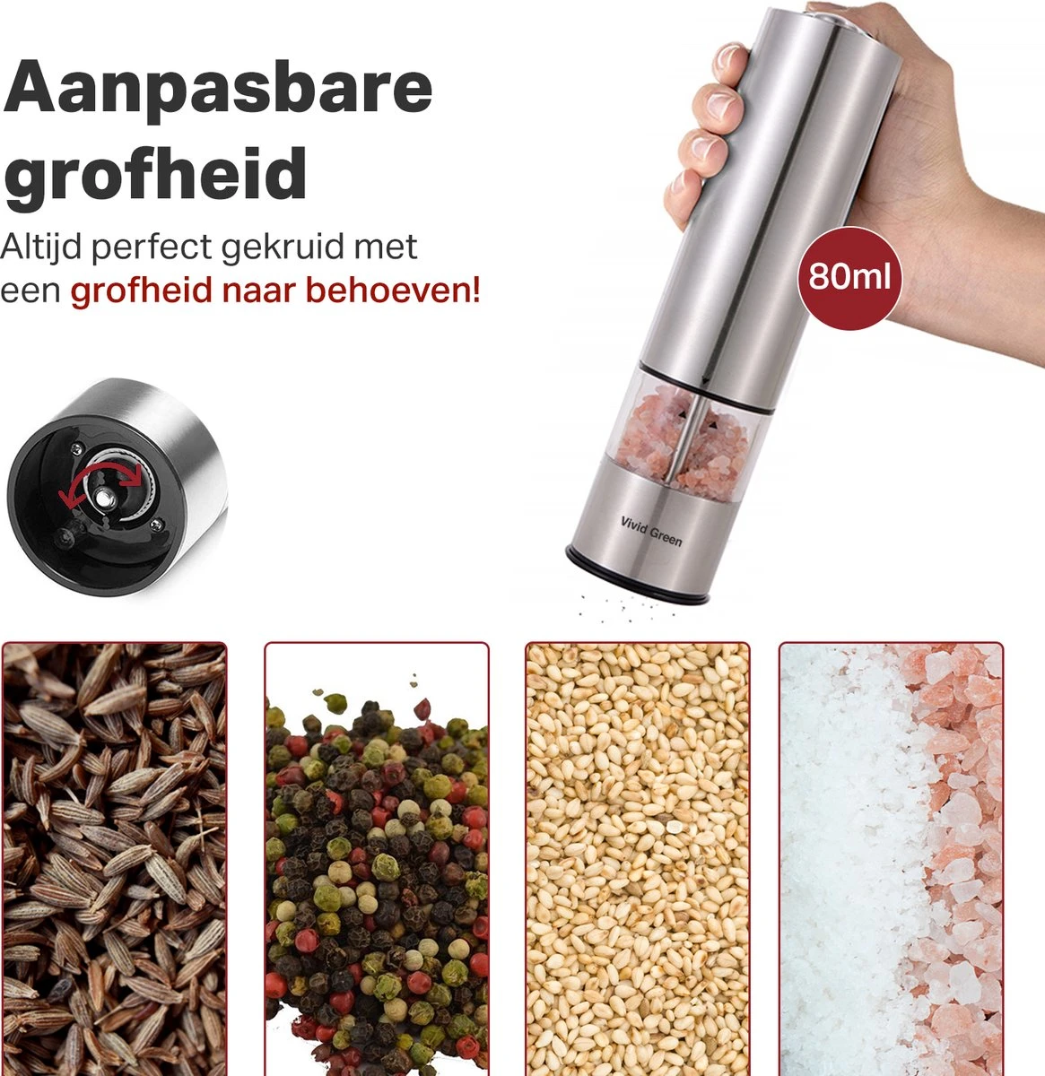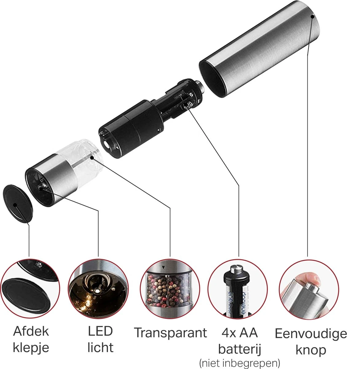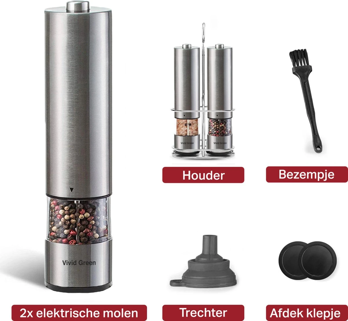✔Inhoud: 1x Elektrische Peper- en zoutmolen – 1x Stalen houder – 2x Siliconen afdekklepje – 1x Schoonmaaktool – 1x Trechter – 1x Digitale handleiding
