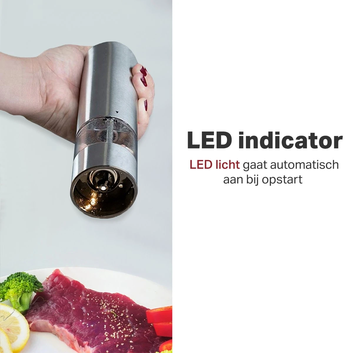 Om bij te houden hoeveel je aan je gerecht hebt toegevoegd schijnt er tijdens het malen een LED-lampje op je gerecht, dus ook in het donker is het geen probleem om je maaltijd op smaak te brengen.