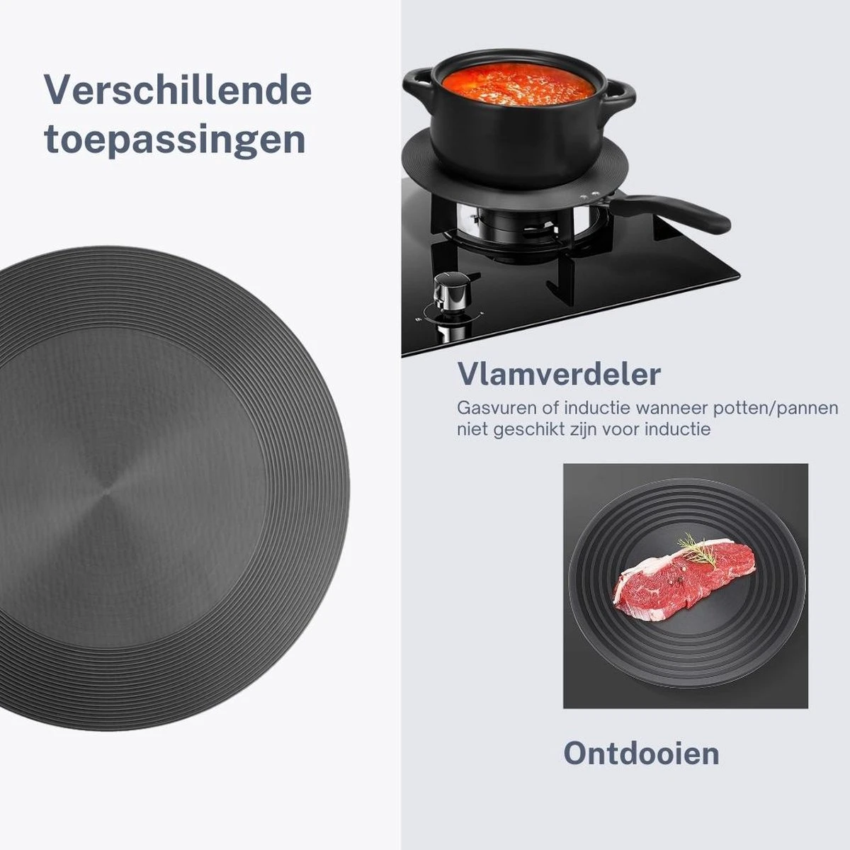 Deze tussenplaat met groeven zorgt er namelijk voor dat je pannen veilig blijven staan en dat je je eten gelijk kan laten ontdooien en nadien bakken in de pan. De hitte wordt namelijk mooi gelijk verspreid. Geen stuk vlees meer dat aan de buitenkant aangebrand is en aan de binnenkant nog bevroren is. Ideaal ook voor slowcooking dus.