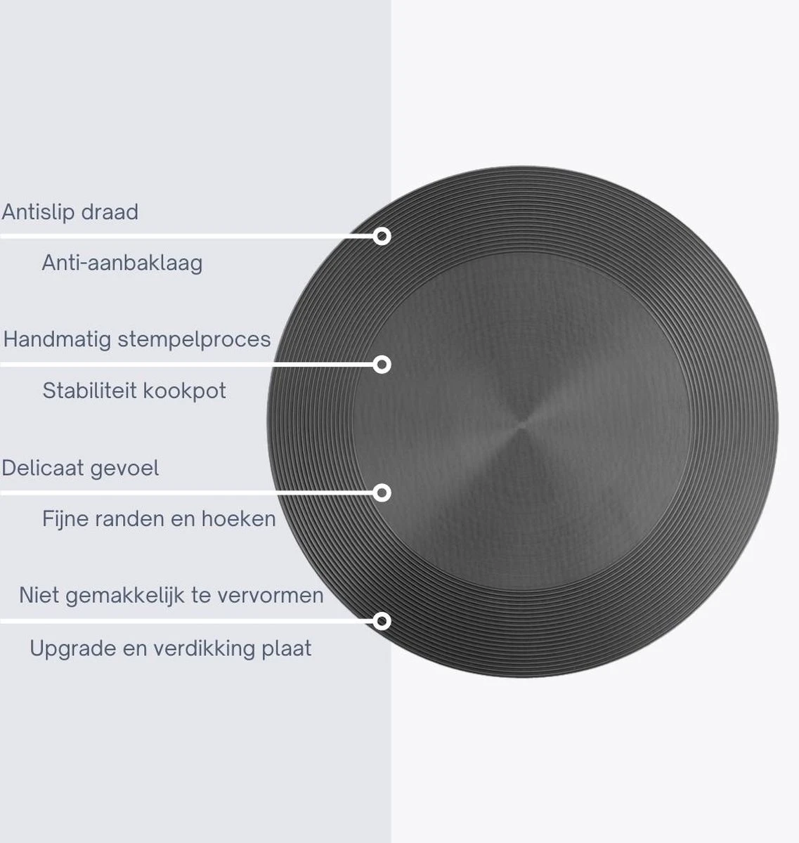 Deze tussenplaat met groeven zorgt er namelijk voor dat je pannen veilig blijven staan en dat je je eten gelijk kan laten ontdooien en nadien bakken in de pan. De hitte wordt namelijk mooi gelijk verspreid. Geen stuk vlees meer dat aan de buitenkant aangebrand is en aan de binnenkant nog bevroren is. Ideaal ook voor slowcooking dus.