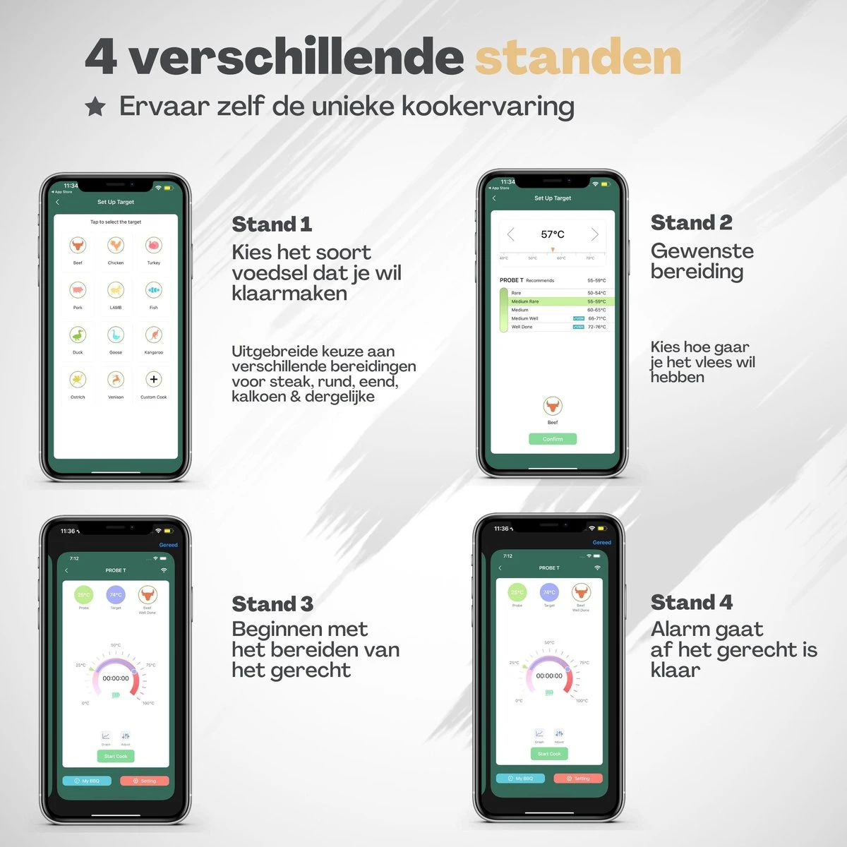 De thermometer is via de bluetooth-functie te bedienen, waardoor je via je telefoon kunt zien wat de temperatuur van je eten is, wanneer het gaar is én nog veel meer!