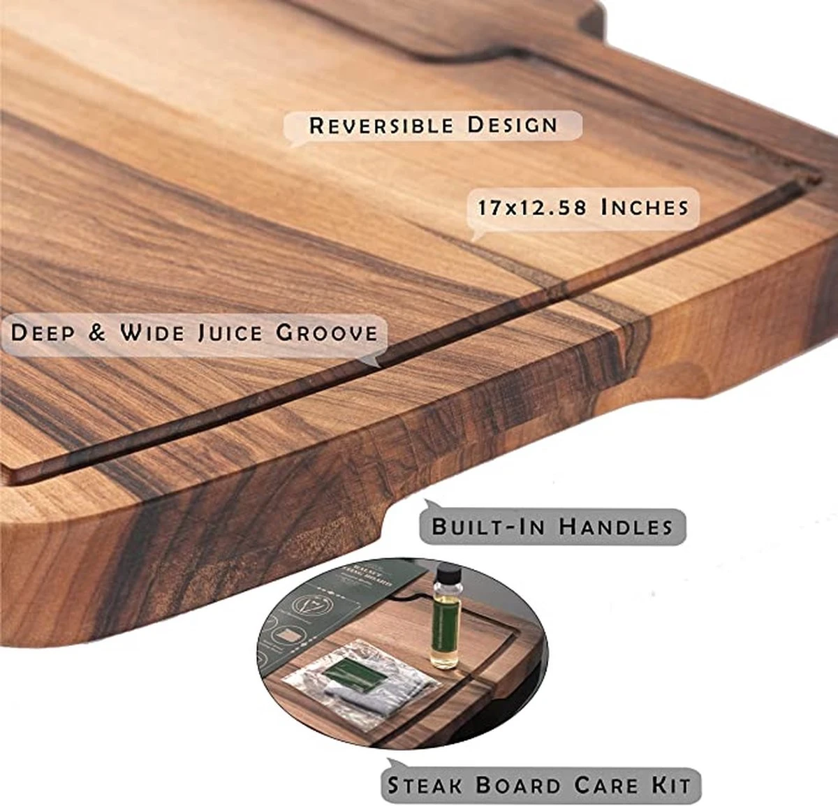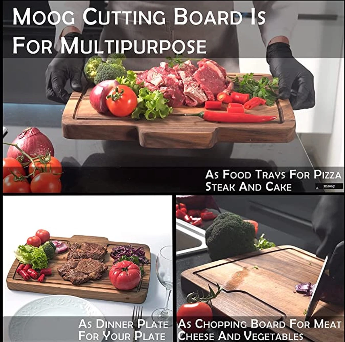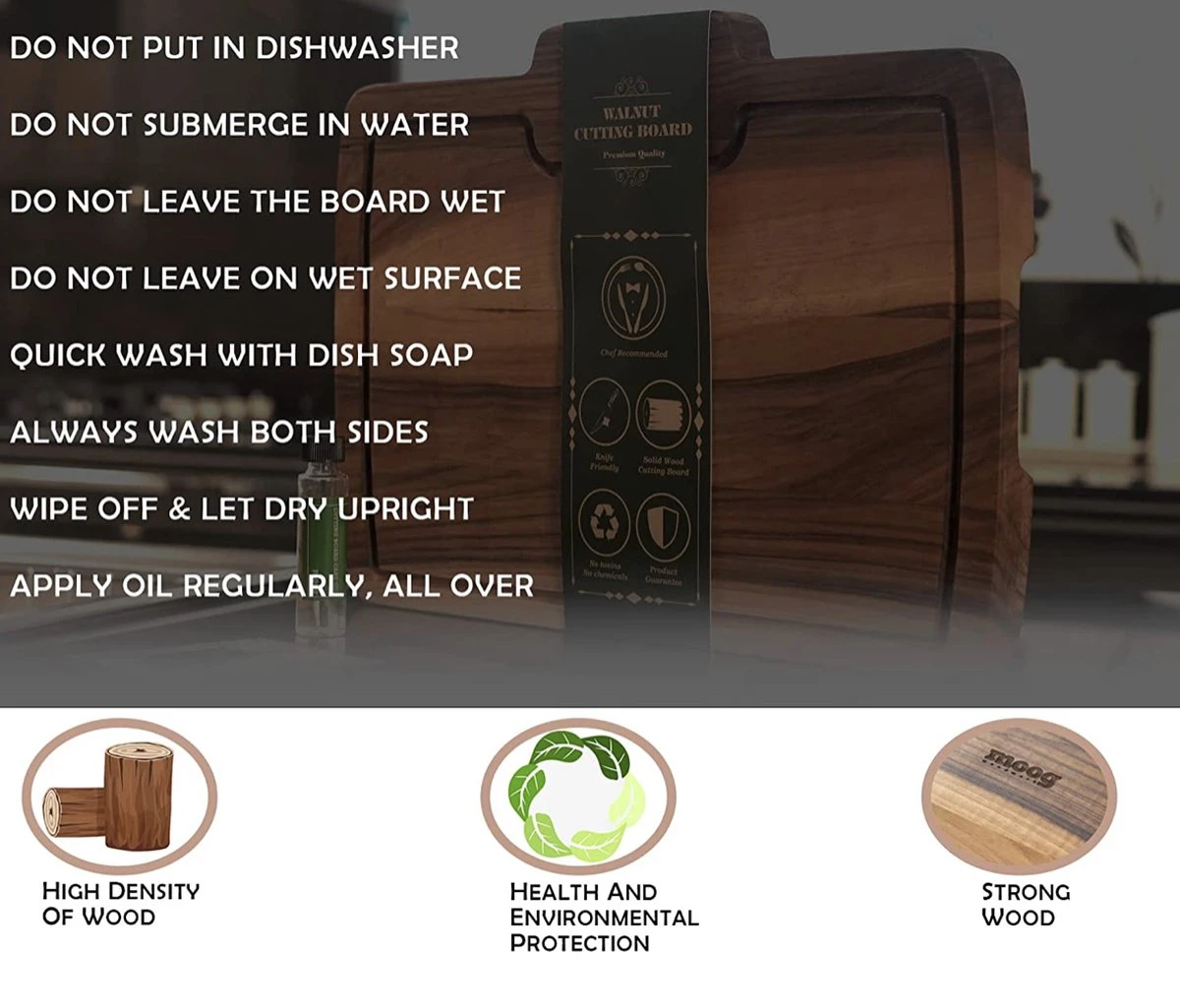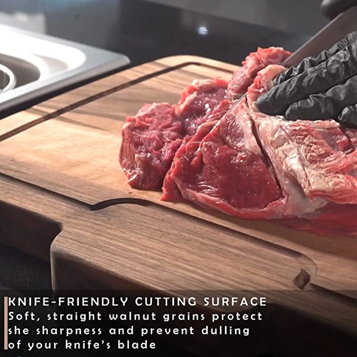 MESVRIENDELIJK OPPERVLAK en OMKEERBAAR: Vergeleken met teak, kersenhout en olijfhout, is zwarte walnoot een zachter hardhout, waardoor een oppervlak ontstaat dat uw dure mes niet dof maakt. Het is een omkeerbaar ontwerp, de ene kant kan worden gebruikt om vlees te snijden en de andere kant kan worden gebruikt om groenten te snijden om kruisbesmetting te voorkomen.