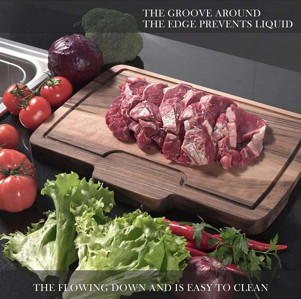 JUICE GROOVE en MULTIPURPOSE: Deze snijplank van zwarte walnoot is uitgerust met een sapgroef om te voorkomen dat groentesap, vruchtensap en vleessap op het aanrecht druppelen. Behalve als snijplank kan hij ook gebruikt worden als kaasplank, charcuterieplank en snackplank. Het is de beste keuze voor gezinnen en restaurants.