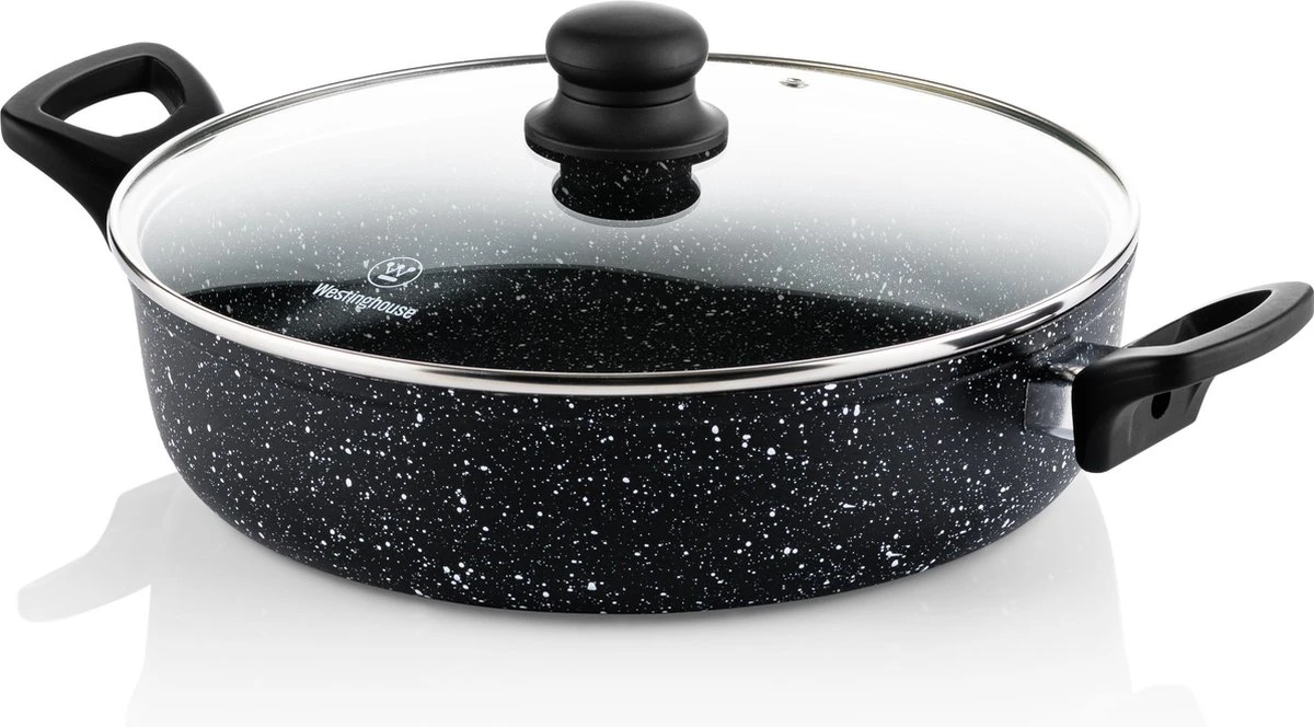 De Westinghouse Zwart Marmer Hapjespan 28cm mag niet ontbreken aan jouw pannencollectie. De hapjespan is ideaal voor het bereiden van bijvoorbeeld eenpansgerechten, een lekkere risotto, paella of een heerlijke pastasaus. De pan is gemaakt uit aluminium en licht in gewicht. Zo verplaats je de hapjespan gemakkelijk van de warmtebron rechtstreeks naar de tafel.
