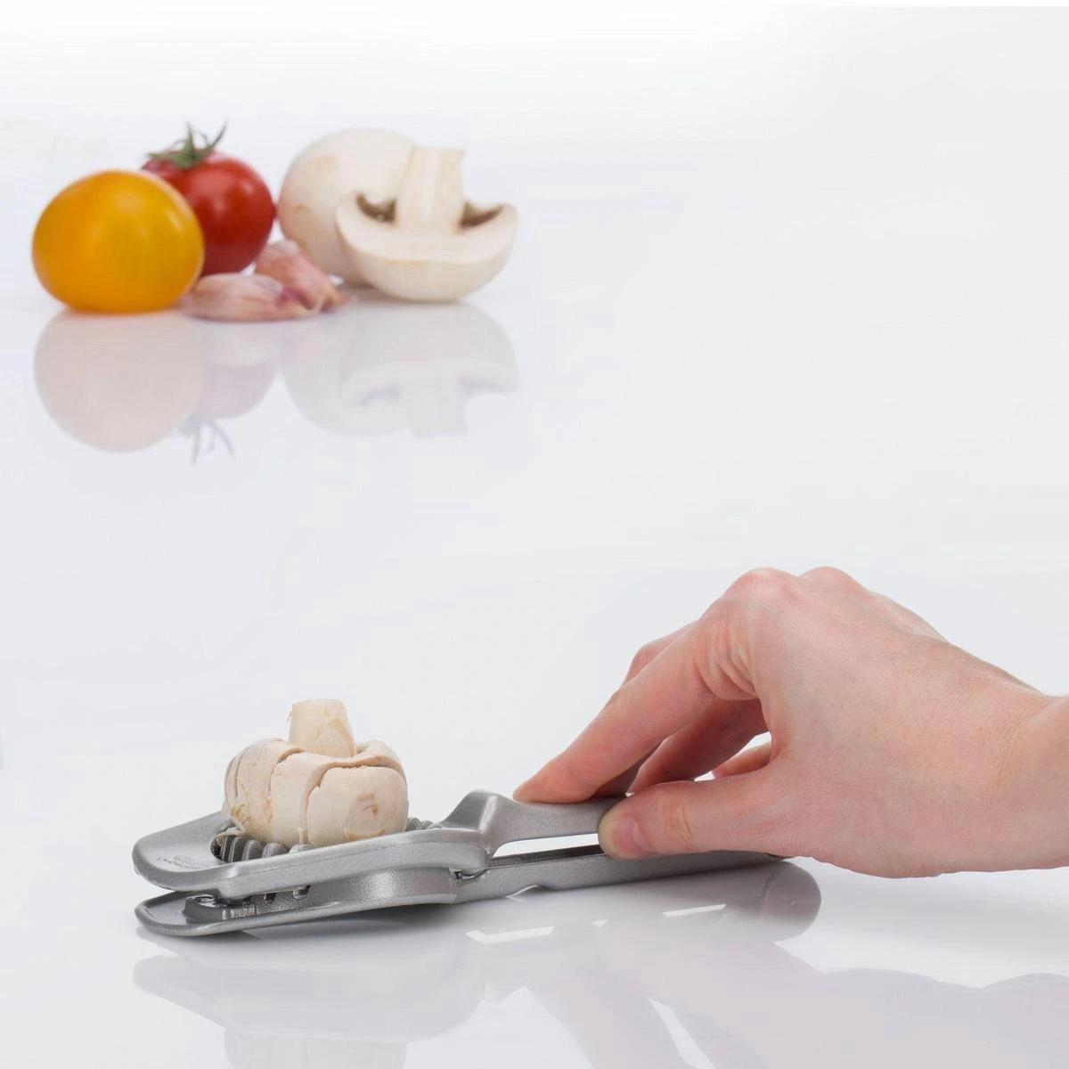 Deze zeer praktische Champion champignonsnijder in de vorm van een tang, is niet alleen perfect om champignons mee te snijden maar ook aardbeien, kiwi’s en andere vruchten zeer gemakkelijk in plakjes gesneden kunnen worden. De tang heeft een lengte van 19,5 cm en heeft 7 kleine roestvrijstalen snijbladen voor mooie, gelijkmatige schijfjes. Ideaal om snel te werken, niet alleen in de professionele, maar ook in de hobby keuken. Door zijn handige bediening ook een welkome keukenhulp voor ouderen en kinderen. Hij is gemaakt van gecoat aluminium en is eenvoudig te reinigen met warm water en een sopje.