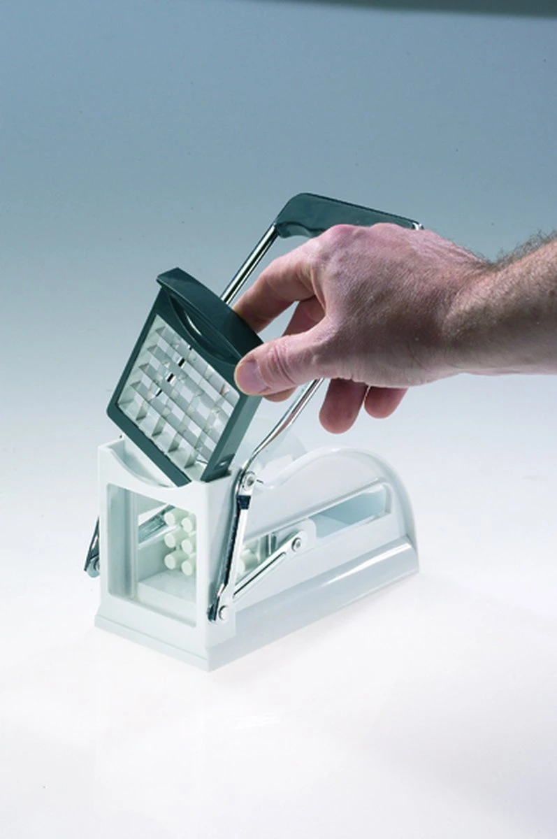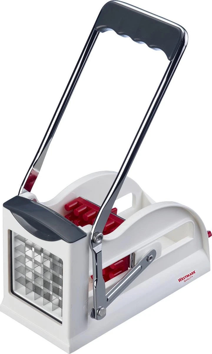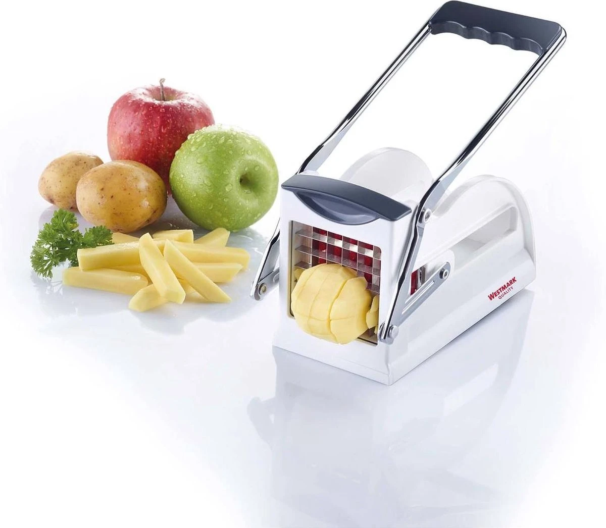 Maak zelf de lekkerste frietjes met deze handige frietsnijder van Westmark. Deze krachtpatser heeft drie verwisselbare scherpe messenramen. De echte Hollandse frietjes maak je met het mes 10 x 10 mm, de Franse frietjes bereid je met de messen van 9 x 9 mm en voor de bekende Belgische frieten gebruik je het mes met de afmeting van 12 x 12 mm. Of je nu gek bent op dunne of dikke frieten, met deze frietsnijder maak je iedere variant in één handomdraai. Ook voor het maken van wortel- of fruitsticks voor een feestje is deze snijder perfect te gebruiken. De frietsnijder is gemaakt van een duurzame kunststof behuizing en heeft RVS messen. Voor reiniging wordt aangeraden de messen af te spoelen met warm water en een sopje. De afmeting van deze frietsnijder is 24 x 8,5 x 11 cm.