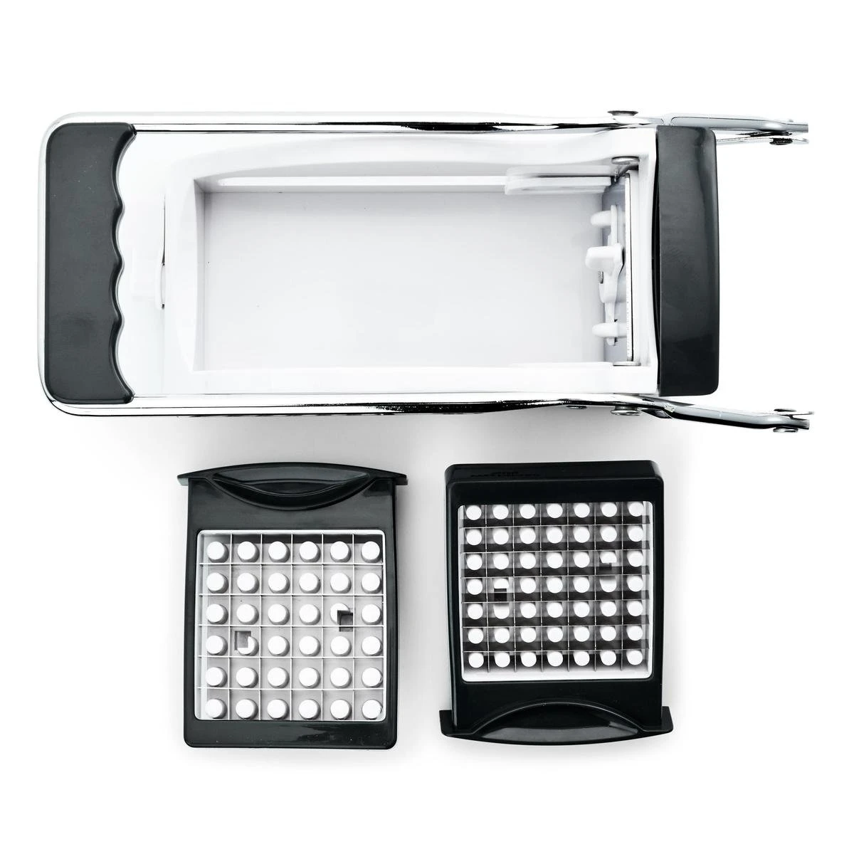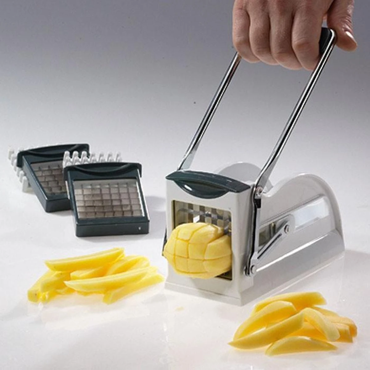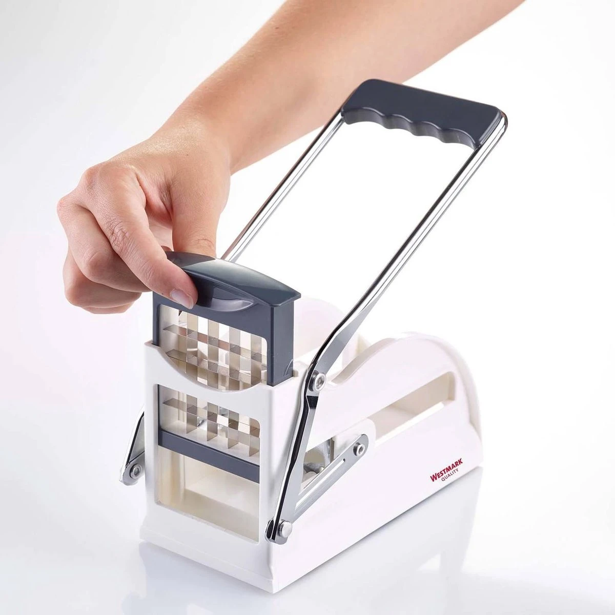 Maak zelf de lekkerste frietjes met deze handige frietsnijder van Westmark. Deze krachtpatser heeft drie verwisselbare scherpe messenramen. De echte Hollandse frietjes maak je met het mes 10 x 10 mm, de Franse frietjes bereid je met de messen van 9 x 9 mm en voor de bekende Belgische frieten gebruik je het mes met de afmeting van 12 x 12 mm. Of je nu gek bent op dunne of dikke frieten, met deze frietsnijder maak je iedere variant in één handomdraai. Ook voor het maken van wortel- of fruitsticks voor een feestje is deze snijder perfect te gebruiken. De frietsnijder is gemaakt van een duurzame kunststof behuizing en heeft RVS messen. Voor reiniging wordt aangeraden de messen af te spoelen met warm water en een sopje. De afmeting van deze frietsnijder is 24 x 8,5 x 11 cm.
