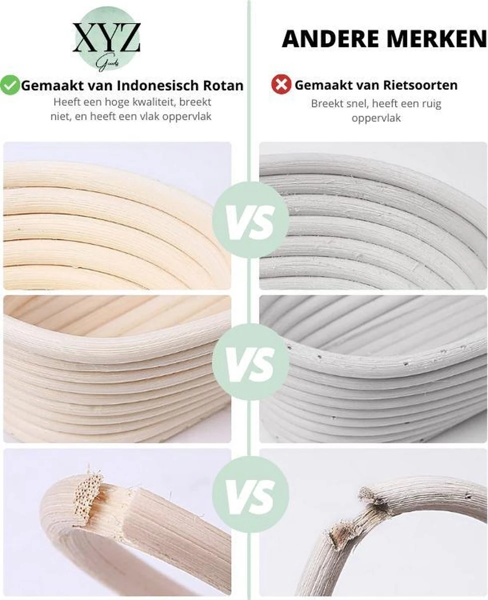Niets is zo lekker dan vers eigen gebakken brood. Om u daarbij te helpen hebben wij van XYZ Goods de ideale set voor u samengesteld. Onze set maakt gebruik van alleen de hoogste kwaliteit producten. Zo is onze rijsmand samengesteld van 100% natuurlijk indonesisch rotan, in tegenstelling tot andere rotan of rietsoorten zorgt indonesisch rotan ervoor dat uw brooddeeg optimaal rijst. Zo bakt u het meest luchtige brood met de krokantste korst waar het hele huishouden van kan genieten.