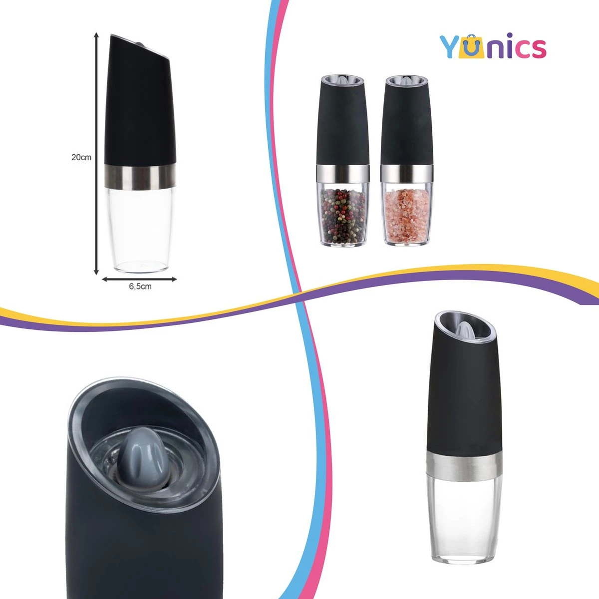Met de elektrische zout- en pepermolen van YUNICS kun je genieten van heerlijke versgemalen kruiden zonder gedoe. Deze molen is niet alleen stijlvol en functioneel, maar ook zeer gemakkelijk te gebruiken.